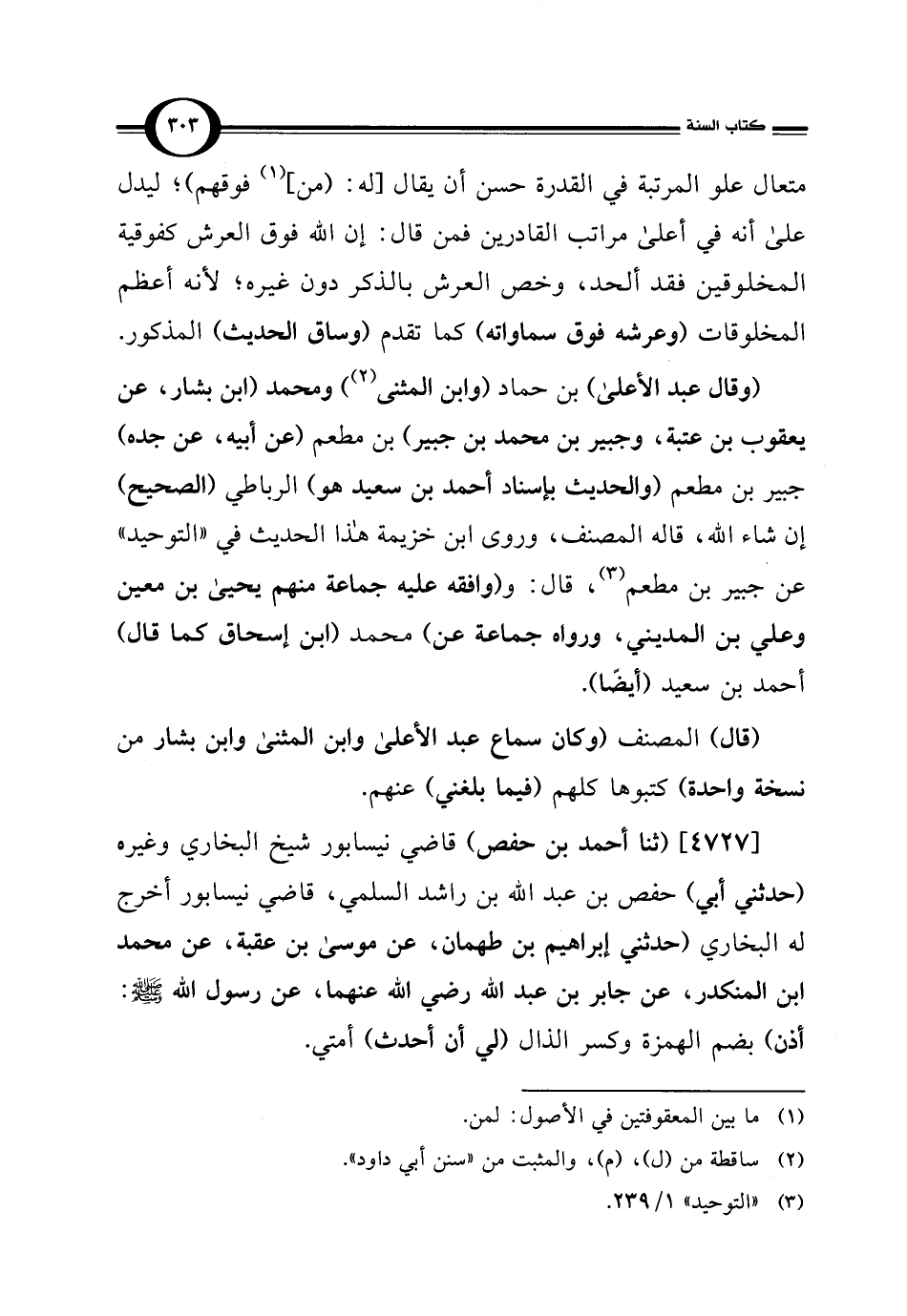 (وقال عبد الأعلى) بن حماد (وابن المثنى) (¬2) ومحمد (ابن بشار، عن يعقوب بن عتبة، وجبير بن محمد بن جبير) بن مطعم (عن أبيه، عن جده) جبير بن مطعم (والحديث بإسناد أحمد بن سعيد هو) الرباطي (الصحيح) إن شاء اللَّه، قاله المصنف، وروى ابن خزيمة هذا الحديث في "التوحيد" عن جبير بن مطعم (¬3)، قال: و (وافقه عليه جماعة منهم يحيى بن معين وعلي بن المديني، ورواه جماعة عن) محمد (ابن إسحاق كما قال) أحمد بن سعيد (أيضًا).
