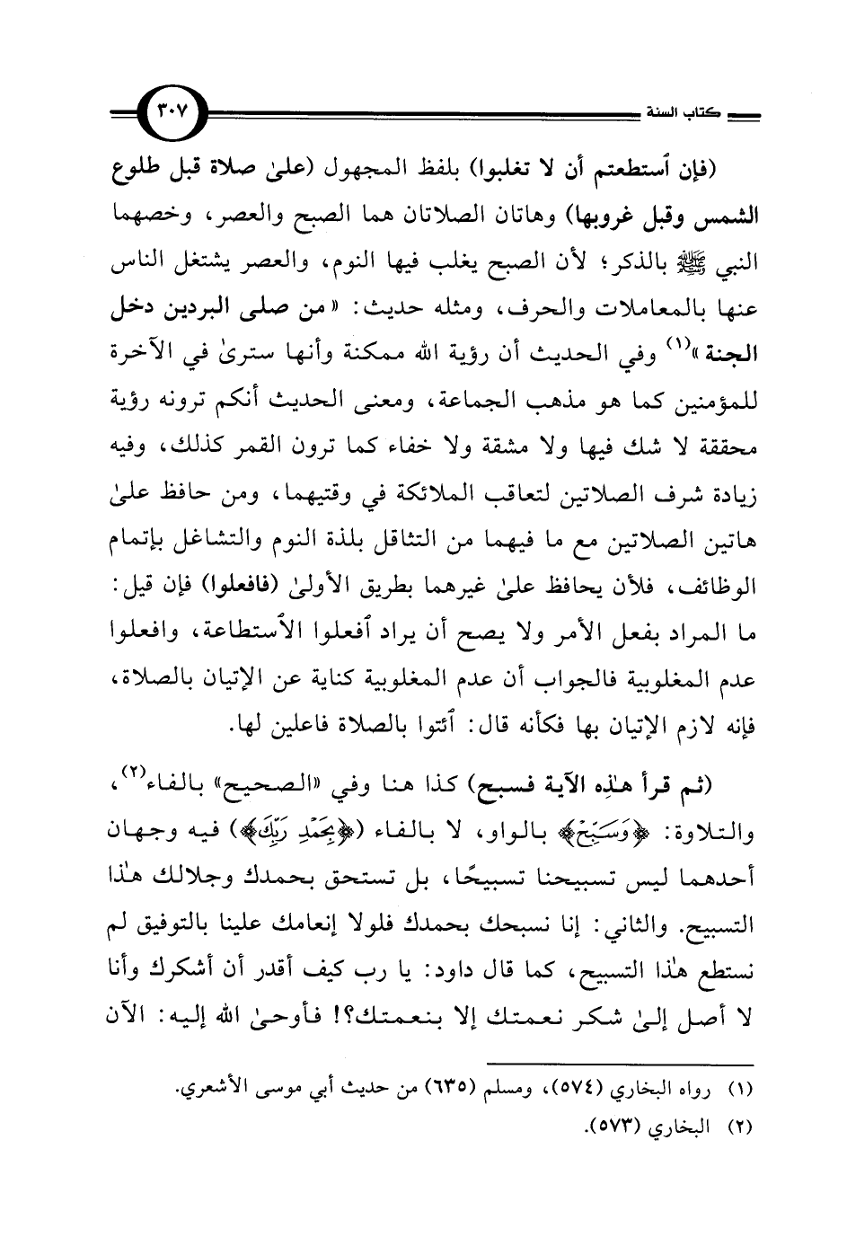 (فإن استطعتم أن لا تغلبوا) بلفظ المجهول (على صلاة قبل طلوع الشمس وقبل غروبها) وهاتان الصلاتان هما الصبح والعصر، وخصهما النبي -صلى اللَّه عليه وسلم- بالذكر؛ لأن الصبح يغلب فيها النوم، والعصر يشتغل الناس عنها بالمعاملات والحرف، ومثله حديث: "من صلى البردين دخل الجنة" (¬1) وفي الحديث أن رؤية اللَّه ممكنة وأنها سترى في الآخرة للمؤمنين كما هو مذهب الجماعة، ومعنى الحديث أنكم ترونه رؤية محققة لا شك فيها ولا مشقة ولا خفاء كما ترون القمر كذلك، وفيه زيادة شرف الصلاتين لتعاقب الملائكة في وقتيهما، ومن حافظ على هاتين الصلاتين مع ما فيهما من التثاقل بلذة النوم والتشاغل بإتمام الوظائف، فلأن يحافظ على غيرهما بطريق الأولى (فافعلوا) فإن قيل: ما المراد بفعل الأمر ولا يصح أن يراد افعلوا الاستطاعة، وافعلوا عدم المغلوبية فالجواب أن عدم المغلوبية كناية عن الإتيان بالصلاة، فإنه لازم الإتيان بها فكأنه قال: ائتوا بالصلاة فاعلين لها.