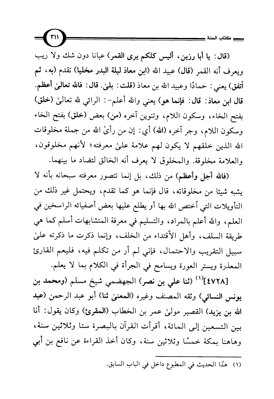 (قال: يا أبا رزين، أليس كلكم يرى القمر) عيانا دون شك ولا ريب ويعرف أنه القمر (قال) عبيد اللَّه (ابن معاذ ليلة البدر مخليا) تقدم (به، ثم اتفق) يعني: حمادًا وعبيد اللَّه بن معاذ (قلت: بلى. قال: فاللَّه تعالى أعظم. قال ابن معاذ: قال: فإنما هو) يعني واللَّه أعلم-: الرائي للَّه تعالى (خلق) بفتح الخاء، وسكون اللام، وتنوين آخره (من) بعض (خلق) بفتح الخاء وسكون اللام، وجر آخره (اللَّه) أي: إن من رأى اللَّه من جملة مخلوقات اللَّه الذين خلقهم لا يكون لهم علامة على معرفته؛ لأنهم مخلوقون، والعلامة مخلوقة. والمخلوق لا يعرف أنه الخالق لتضاد ما بينهما.