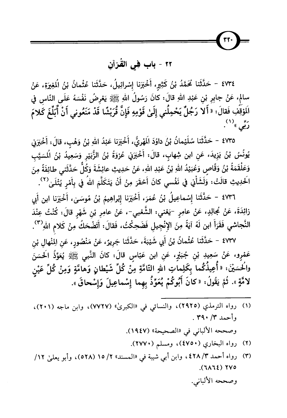 4734 - حَدَّثَنا مُحَمَّدُ بْنُ كَثِيرٍ، أَخْبَرَنا إِسْرائِيلُ، حَدَّثَنا عُثْمان بْنُ المُغِيرَة، عَنْ سالِمٍ، عَنْ جابِرِ بْنِ عَبْدِ اللَّهِ قالَ: كانَ رَسُول اللَّهِ -صلى اللَّه عليه وسلم- يَعْرِضُ نَفْسَهُ عَلَى النّاسِ في المَوْقِفِ فَقالَ: "أَلا رَجُلٌ يَحْمِلُني إِلَى قَوْمِهِ فَإِنَّ قُرَيْشًا قَدْ مَنَعُوني أَنْ أُبَلِّغَ كَلامَ رَبِّي" (¬1).