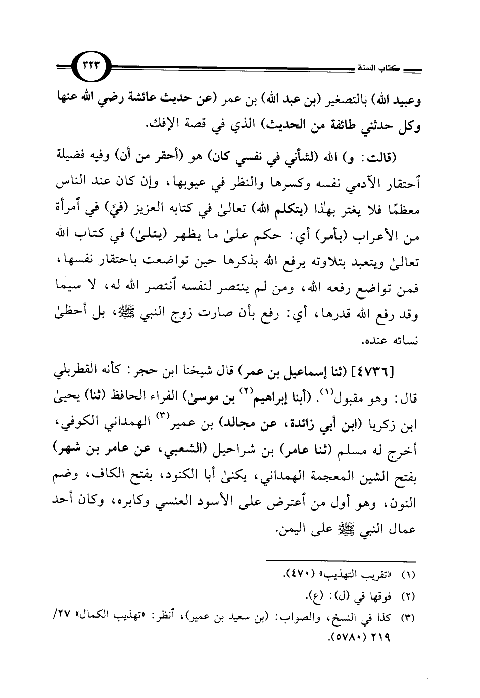 [4736] (ثنا إسماعيل بن عمر) قال شيخنا ابن حجر: كأنه القطربلي قال: وهو مقبول (¬1). (أبنا إبراهيم (¬2) بن موسى) الفراء الحافظ (ثنا) يحيى ابن زكريا (ابن أبي زائدة، عن مجالد) بن عمير (¬3) الهمداني الكوفي، أخرج له مسلم (ثنا عامر) بن شراحيل (الشعبي، عن عامر بن شهر) بفتح الشين المعجمة الهمداني، يكنى أبا الكنود، بفتح الكاف، وضم النون، وهو أول من اعترض على الأسود العنسي وكابره، وكان أحد عمال النبي -صلى اللَّه عليه وسلم- على اليمن.