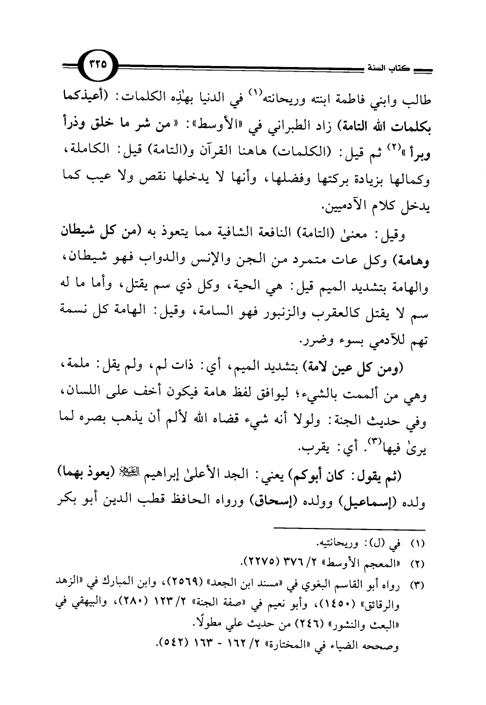طالب وابني فاطمة ابنته وريحانته (¬1) في الدنيا بهذِه الكلمات: (أعيذكما بكلمات اللَّه التامة) زاد الطبراني في "الأوسط": "من شر ما خلق وذرأ وبرأ" (¬2) ثم قيل: (الكلمات) هاهنا القرآن و (التامة) قيل: الكاملة، وكمالها بزيادة بركتها وفضلها، وأنها لا يدخلها نقص ولا عيب كما يدخل كلام الآدميين.