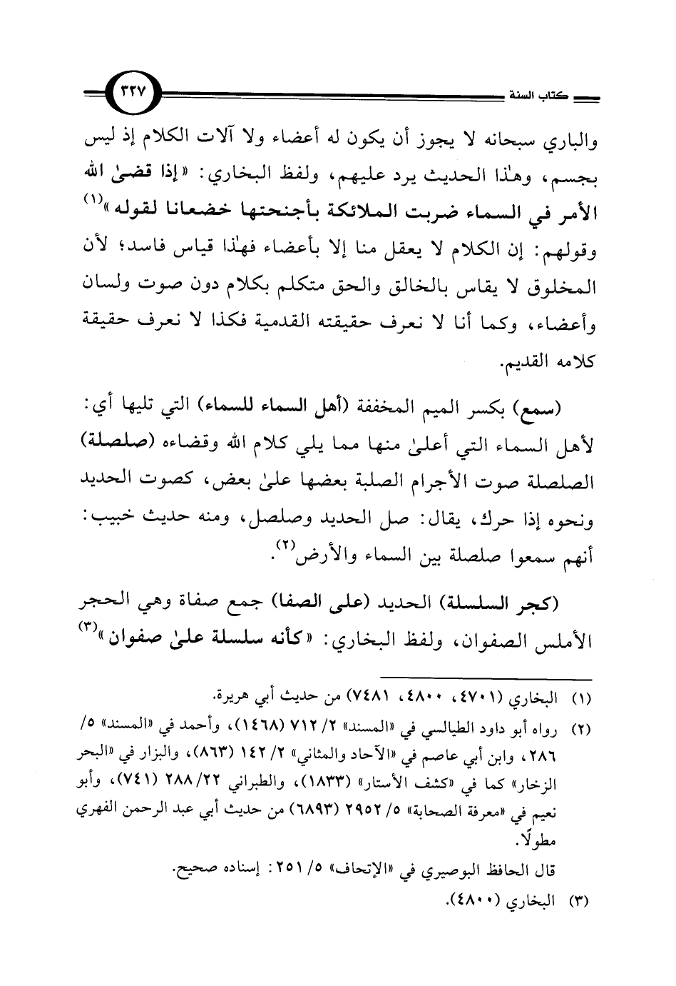 والباري سبحانه لا يجوز أن يكون له أعضاء ولا آلات الكلام إذ ليس بجسم، وهذا الحديث يرد عليهم، ولفظ البخاري: "إذا قضى اللَّه الأمر في السماء ضربت الملائكة بأجنحتها خضعانا لقوله" (¬1) وقولهم: إن الكلام لا يعقل منا إلا بأعضاء فهذا قياس فاسد؛ لأن المخلوق لا يقاس بالخالق والحق متكلم بكلام دون صوت ولسان وأعضاء، وكما أنا لا نعرف حقيقته القدمية فكذا لا نعرف حقيقة كلامه القديم.