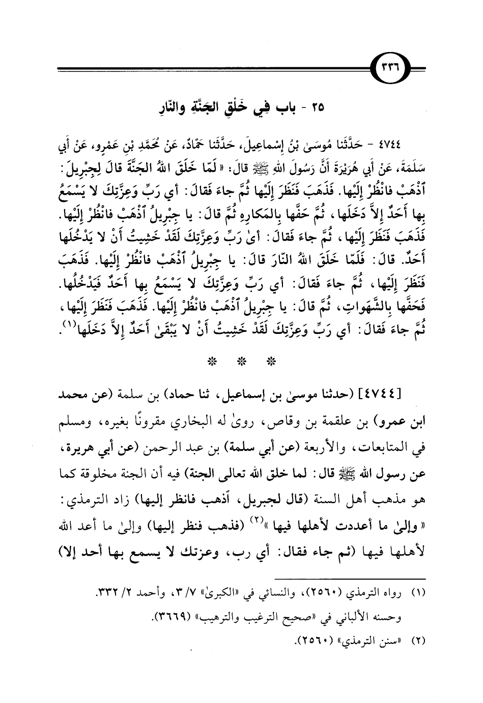 [4744] (حدثنا موسى بن إسماعيل، ثنا حماد) بن سلمة (عن محمد ابن عمرو) بن علقمة بن وقاص، روى له البخاري مقرونًا بغيره، ومسلم في المتابعات، والأربعة (عن أبي سلمة) بن عبد الرحمن (عن أبي هريرة، عن رسول اللَّه -صلى اللَّه عليه وسلم- قال: لما خلق اللَّه تعالى الجنة) فيه أن الجنة مخلوقة كما هو مذهب أهل السنة (قال لجبريل، اذهب فانظر إليها) زاد الترمذي: "وإلى ما أعددت لأهلها فيها" (¬2) (فذهب فنظر إليها) وإلى ما أعد اللَّه لأهلها فيها (ثم جاء فقال: أي رب، وعزتك لا يسمع بها أحد إلا)