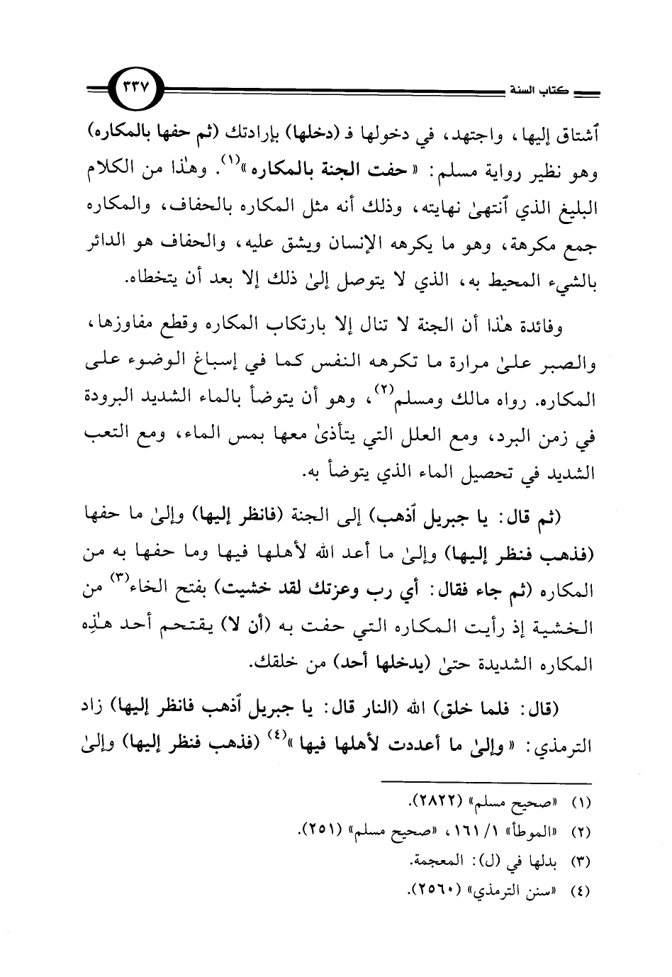 اشتاق إليها، واجتهد، في دخولها فـ (دخلها) بإرادتك (ثم حفها بالمكاره) وهو نظير رواية مسلم: "حفت الجنة بالمكاره" (¬1). وهذا من الكلام البليغ الذي انتهى نهايته، وذلك أنه مثل المكاره بالحفاف، والمكاره جمع مكرهة، وهو ما يكرهه الإنسان ويشق عليه، والحفاف هو الدائر بالشيء المحيط به، الذي لا يتوصل إلى ذلك إلا بعد أن يتخطاه.