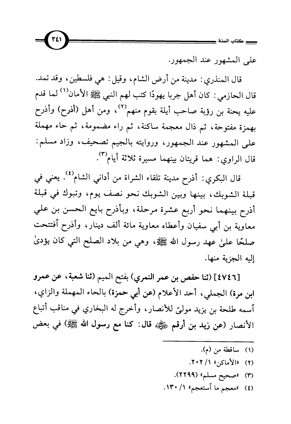 قال المنذري: مدينة من أرض الشام، وقيل: هي فلسطين، وقد تمد. قال الحازمي: كان أهل جربا يهودًا كتب لهم النبي -صلى اللَّه عليه وسلم- الأمان (¬1) لما قدم عليه يحنة بن رؤبة صاحب أيلة بقوم منهم (¬2)، ومن أهل (أذرح) وأذرح بهمزة مفتوحة، ثم ذال معجمة ساكنة، ثم راء مضمومة، ثم جاء مهملة على المشهور عند الجمهور، وروايته بالجيم تصحيف، وزاد مسلم: قال الراوي: هما قريتان بينهما مسيرة ثلاثة أيام (¬3).