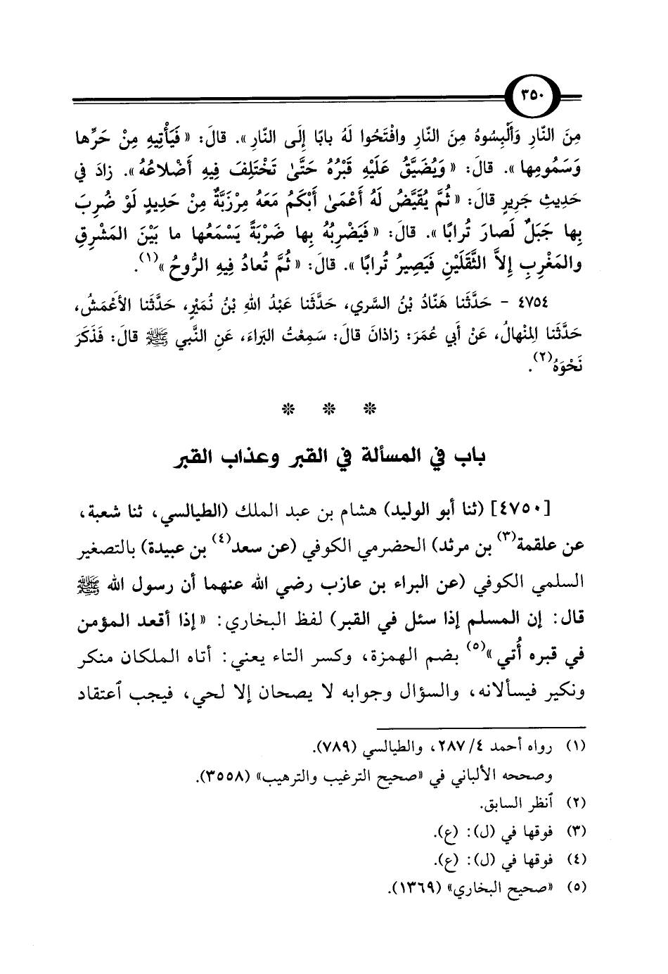 [4750] (ثنا أبو الوليد) هشام بن عبد الملك (الطيالسي، ثنا شعبة، عن علقمة (¬3) بن مرثد) الحضرمي الكوفي (عن سعد (¬4) بن عبيدة) بالتصغير السلمي الكوفي (عن البراء بن عازب رضي اللَّه عنهما أن رسول اللَّه -صلى اللَّه عليه وسلم- قال: إن المسلم إذا سئل في القبر) لفظ البخاري: "إذا أقعد المؤمن في قبره أُتي" (¬5) بضم الهمزة، وكسر التاء يعني: أتاه الملكان منكر ونكير فيسألانه، والسؤال وجوابه لا يصحان إلا لحي، فيجب اعتقاد