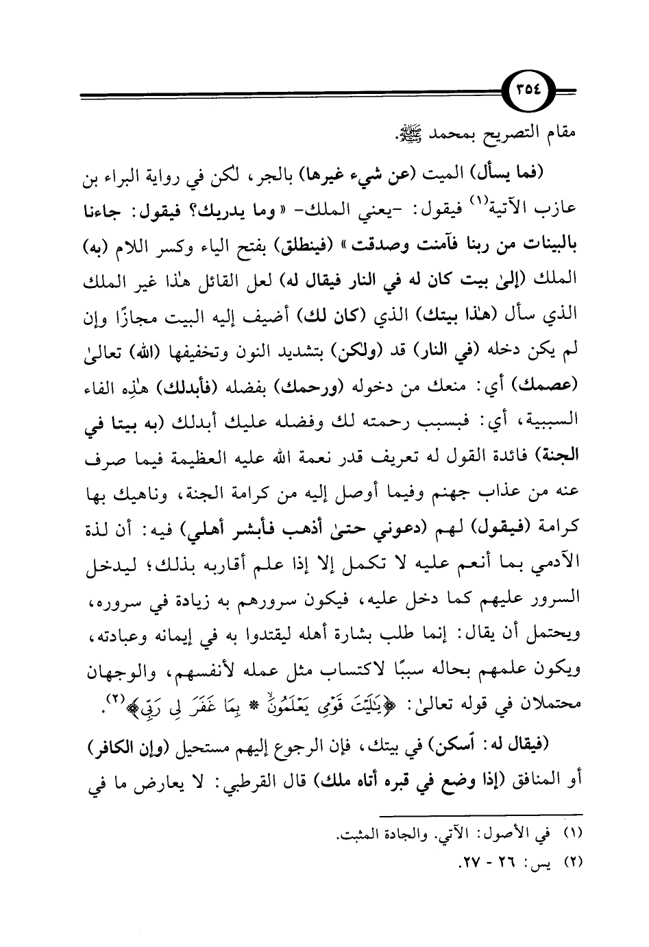 (فما يسأل) الميت (عن شيء غيرها) بالجر، لكن في رواية البراء بن عازب الآتية (¬1) فيقول: -يعني الملك- "وما يدريك؟ فيقول: جاءنا بالبينات من ربنا فآمنت وصدقت" (فينطلق) بفتح الياء وكسر اللام (به) الملك (إلى بيت كان له في النار فيقال له) لعل القائل هذا غير الملك الذي سأل (هذا بيتك) الذي (كان لك) أضيف إليه البيت مجازًا وإن لم يكن دخله (في النار) قد (ولكن) بتشديد النون وتخفيفها (اللَّه) تعالى (عصمك) أي: منعك من دخوله (ورحمك) بفضله (فأبدلك) هذِه الفاء السببية، أي: فبسبب رحمته لك وفضله عليك أبدلك (به بيتا في الجنة) فائدة القول له تعريف قدر نعمة اللَّه عليه العظيمة فيما صرف عنه من عذاب جهنم وفيما أوصل إليه من كرامة الجنة، وناهيك بها كرامة (فيقول) لهم (دعوني حتى أذهب فأبشر أهلي) فيه: أن لذة الآدمي بما أنعم عليه لا تكمل إلا إذا علم أقاربه بذلك؛ ليدخل السرور عليهم كما دخل عليه، فيكون سرورهم به زيادة في سروره، ويحتمل أن يقال: إنما طلب بشارة أهله ليقتدوا به في إيمانه وعبادته، ويكون علمهم بحاله سببًا لاكتساب مثل عمله لأنفسهم، والوجهان محتملان في قوله تعالى: {يَالَيْتَ قَوْمِي يَعْلَمُونَ (26) مَا غَفَرَ لِي رَبِّي} (¬2).