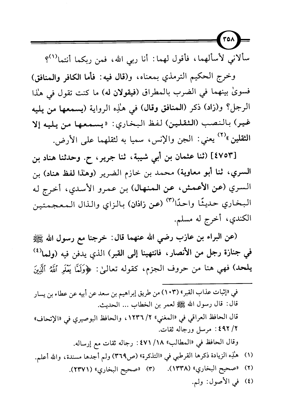 [4753] (ثنا عثمان بن أبي شيبة، ثنا جرير، ح. وحدثنا هناد بن السري، ثنا أبو معاوية) محمد بن خازم الضرير (وهذا لفظ هناد) بن السري (عن الأعمش، عن المنهال) بن عمرو الأسدي، أخرج له البخاري حديثًا واحدًا (¬3) (عن زاذان) بالزاي والذال المعجمتين الكندي، أخرج له مسلم.