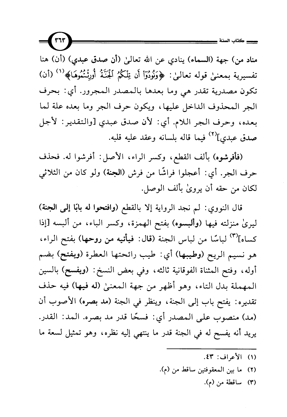 مناد من) جهة (السماء) ينادي عن اللَّه تعالى (أن صدق عبدي) (أن) هنا تفسيرية بمعنى قوله تعالى: {وَنُودُوا أَنْ تِلْكُمُ الْجَنَّةُ أُورِثْتُمُوهَا} (¬1) (أن) تكون مصدرية تقدر هي وما بعدها بالمصدر المجرور. أي: بحرف الجر المحذوف الداخل عليها، ويكون حرف الجر وما بعده علة لما بعده، وحرف الجر اللام. أي: لأن صدق عبدي [والتقدير: لأجل صدق عبدي] (¬2) فيما قاله بلسانه وعقد عليه قلبه.