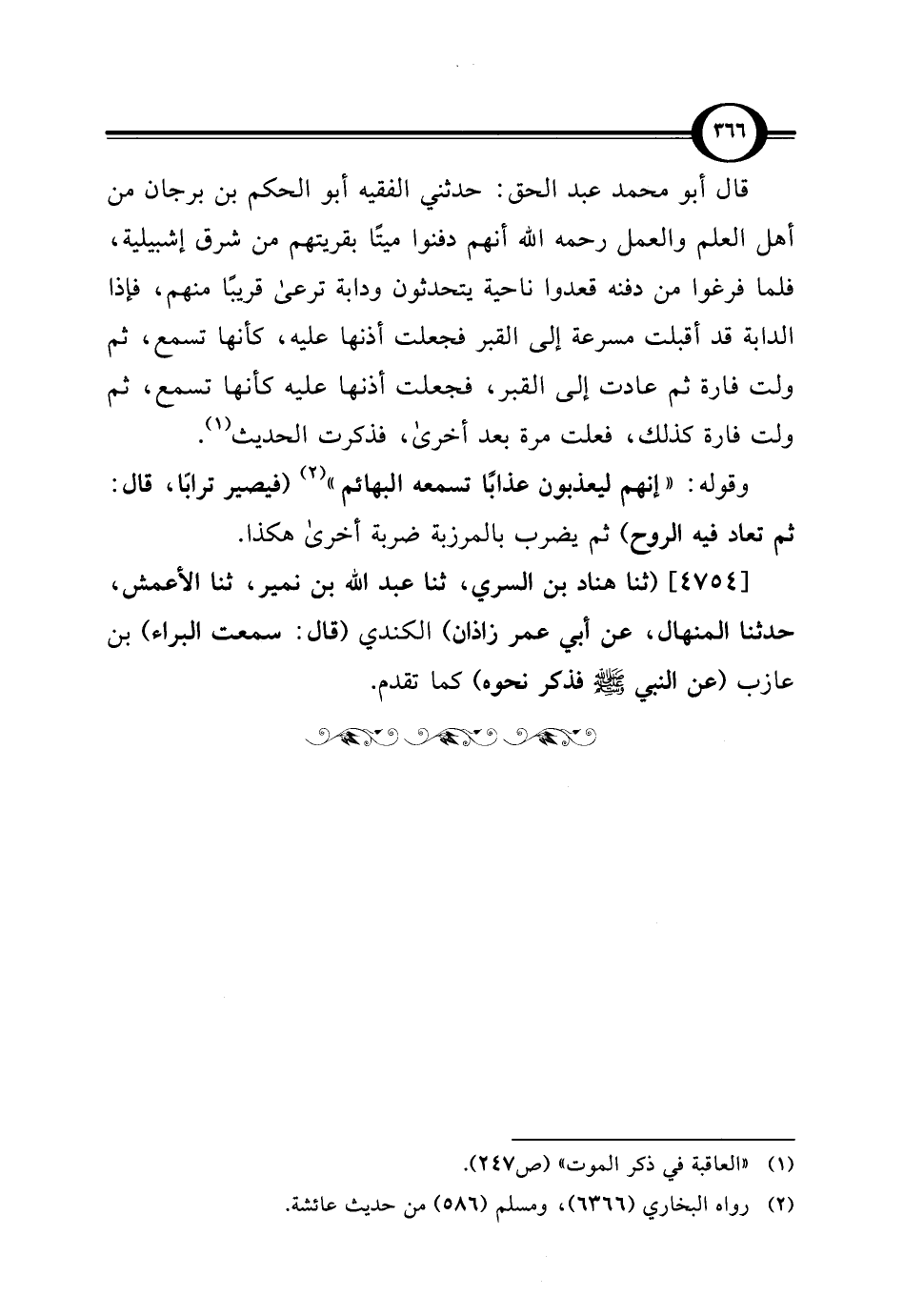 قال أبو محمد عبد الحق: حدثني الفقيه أبو الحكم بن برجان من أهل العلم والعمل رحمه اللَّه أنهم دفنوا ميتًا بقريتهم من شرق إشبيلية، فلما فرغوا من دفنه قعدوا ناحية يتحدثون ودابة ترعى قريبًا منهم، فإذا الدابة قد أقبلت مسرعة إلى القبر فجعلت أذنها عليه، كأنها تسمع، ثم ولت فارة ثم عادت إلى القبر، فجعلت أذنها عليه كأنها تسمع، ثم ولت فارة كذلك، فعلت مرة بعد أخرى، فذكرت الحديث (¬1).