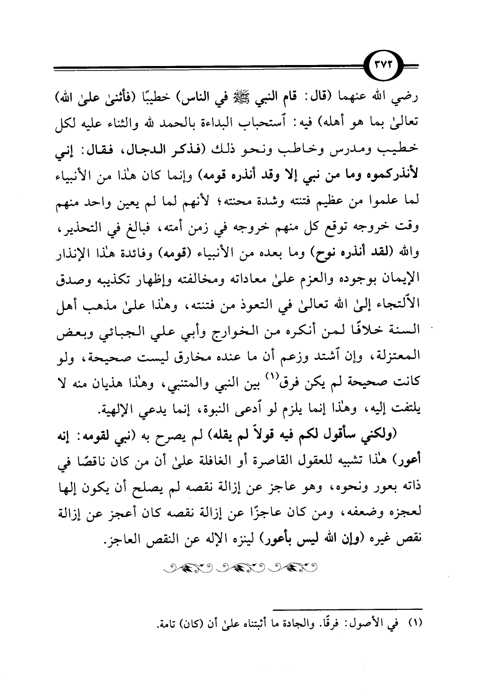 رضي اللَّه عنهما (قال: قام النبي -صلى اللَّه عليه وسلم- في الناس) خطيبًا (فأثنى على اللَّه) تعالى بما هو أهله) فيه: استحباب البداءة بالحمد للَّه والثناء عليه لكل خطيب ومدرس وخاطب ونحو ذلك (فذكر الدجال، فقال: إني لأنذركموه وما من نبي إلا وقد أنذره قومه) وإنما كان هذا من الأنبياء لما علموا من عظيم فتنته وشدة محنته؛ لأنهم لما لم يعين واحد منهم وقت خروجه توقع كل منهم خروجه في زمن أمته، فبالغ في التحذير، واللَّه (لقد أنذره نوح) وما بعده من الأنبياء (قومه) وفائدة هذا الإنذار الإيمان بوجوده والعزم على معاداته ومخالفته وإظهار تكذيبه وصدق الالتجاء إلى اللَّه تعالى في التعوذ من فتنته، وهذا على مذهب أهل السنة خلافًا لمن أنكره من الخوارج وأبي علي الجبائي وبعض المعتزلة، وإن اشتد وزعم أن ما عنده مخارق ليست صحيحة، ولو كانت صحيحة لم يكن فرق (¬1) بين النبي والمتنبي، وهذا هذيان منه لا يلتفت إليه، وهذا إنما يلزم لو ادعى النبوة، إنما يدعي الإلهية.