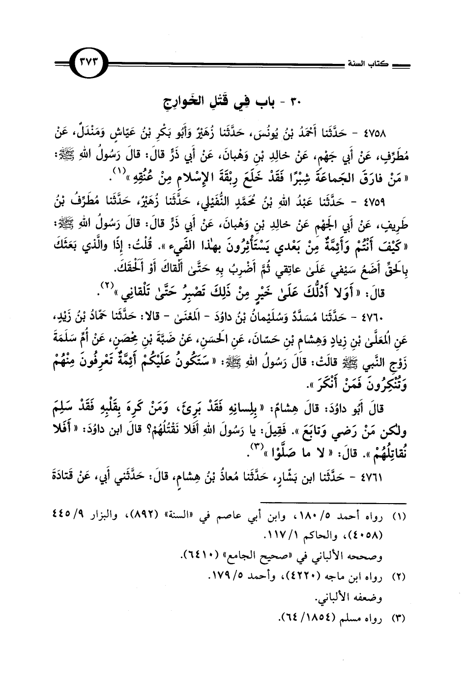 قالَ أَبُو داوُدَ: قالَ هِشامٌ: "بِلِسانِهِ فَقَدْ بَرِئَ، وَمَنْ كَرِهَ بِقَلْبِهِ فَقَدْ سَلِمَ ولكن مَنْ رَضي وَتابَعَ". فَقِيلَ: يا رَسُولَ اللَّهِ أَفَلا نَقْتُلُهُمْ؟ قالَ ابن داوُدَ: "أَفَلا نُقاتِلُهُمْ". قالَ: "لا ما صَلَّوْا" (¬3).