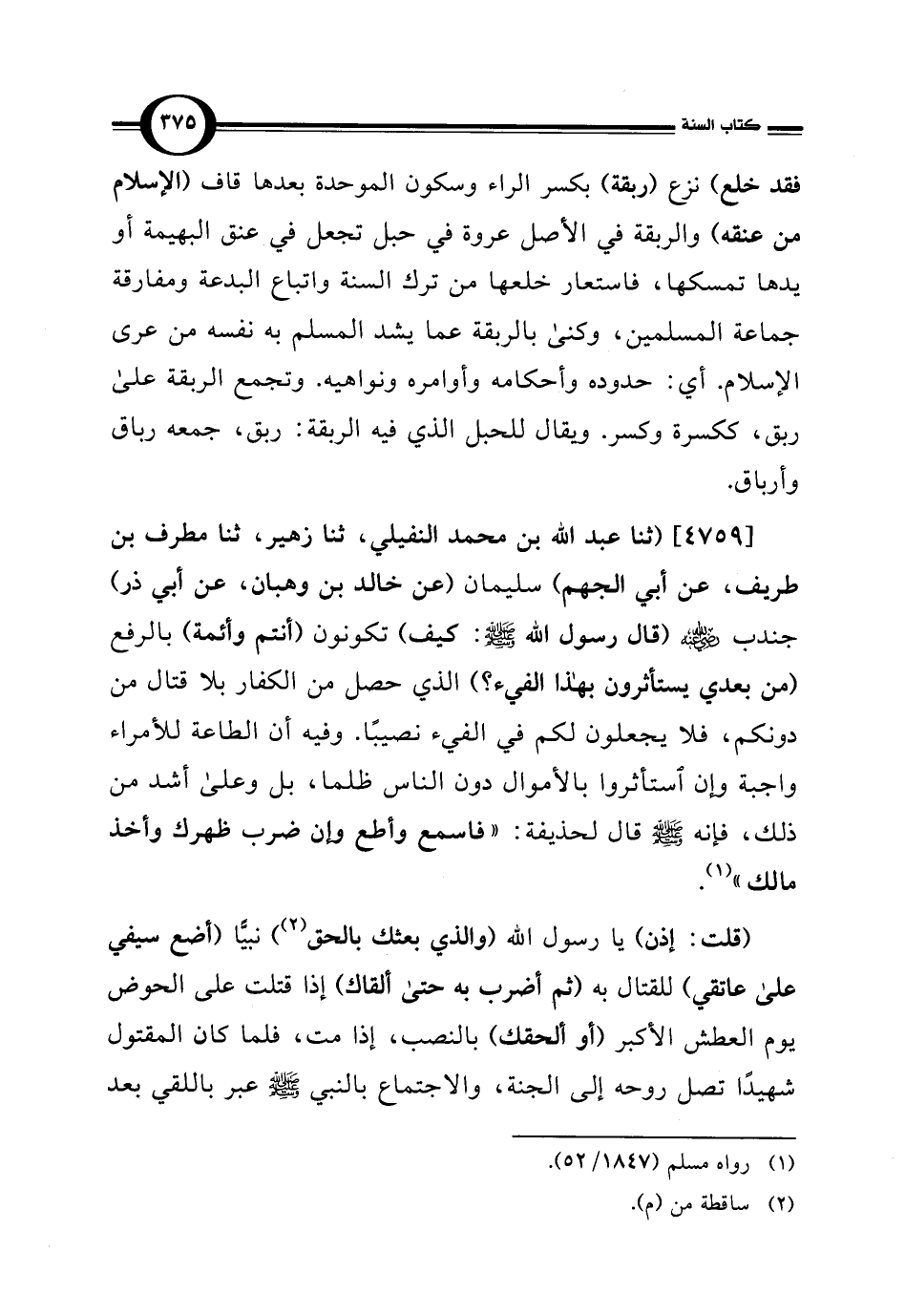 [4759] (ثنا عبد اللَّه بن محمد النفيلي، ثنا زهير، ثنا مطرف بن طريف، عن أبي الجهم) سليمان (عن خالد بن وهبان، عن أبي ذر) جندب -رضي اللَّه عنه- (قال رسول اللَّه -صلى اللَّه عليه وسلم-: كيف) تكونون (أنتم وأئمة) بالرفع (من بعدي يستأثرون بهذا الفيء؟ ) الذي حصل من الكفار بلا قتال من دونكم، فلا يجعلون لكم في الفيء نصيبًا. وفيه أن الطاعة للأمراء واجبة وإن استأثروا بالأموال دون الناس ظلما، بل وعلى أشد من ذلك، فإنه -صلى اللَّه عليه وسلم- قال لحذيفة: "فاسمع وأطع وإن ضرب ظهرك وأخذ مالك" (¬1).