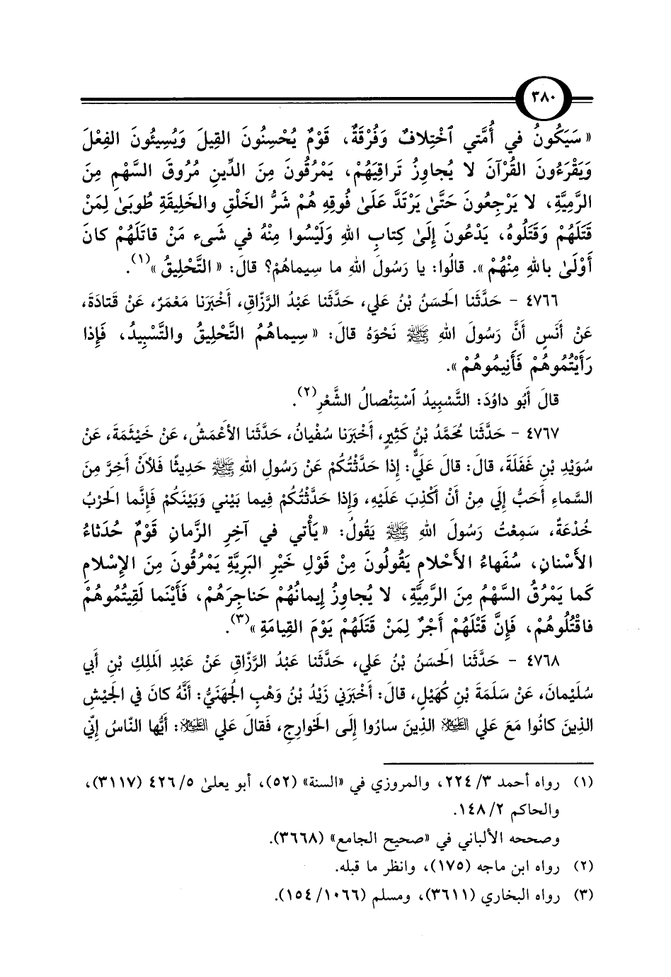 4767 - حَدَّثَنا مُحَمَّدُ بْنُ كَثِيرٍ، أَخْبَرَنا سُفْيانُ، حَدَّثَنا الأَعْمَشُ، عَنْ خَيْثَمَةَ، عَنْ سُوَيْدِ بْنِ غَفَلَةَ، قالَ: قالَ عَليٌّ: إِذا حَدَّثْتُكُمْ عَنْ رَسُولِ اللَّهِ -صلى اللَّه عليه وسلم- حَدِيثًا فَلأَنْ أَخِرَّ مِنَ السَّماءِ أَحَبُّ إِلَي مِنْ أَنْ أَكذِبَ عَلَيْهِ، وإذا حَدَّثْتُكُمْ فِيما بَيْني وَبَيْنَكُمْ فَإِنَّما الحَرْبُ خُدْعَةٌ، سَمِعْتُ رَسُولَ اللَّهِ -صلى اللَّه عليه وسلم- يَقُولُ: "يَأْتي في آخِرِ الزَّمانِ قَوْمٌ حُدَثاءُ الأَسْنانِ، سُفَهاءُ الأَحْلامِ يَقُولُونَ مِنْ قَوْلِ خَيْرِ البَرِيَّةِ يَمْرُقُونَ مِنَ الإِسْلامِ كَما يَمْرُقُ السَّهْمُ مِنَ الرَّمِيَّةِ، لا يُجاوِزُ إِيمانُهُمْ حَناجِرَهُمْ، فَأَيْنَما لَقِيتُمُوهُمْ فاقْتُلُوهُمْ، فَإنَّ قَتْلَهُمْ أَجْرٌ لِمَنْ قَتَلَهُمْ يَوْمَ القِيامَةِ" (¬3).