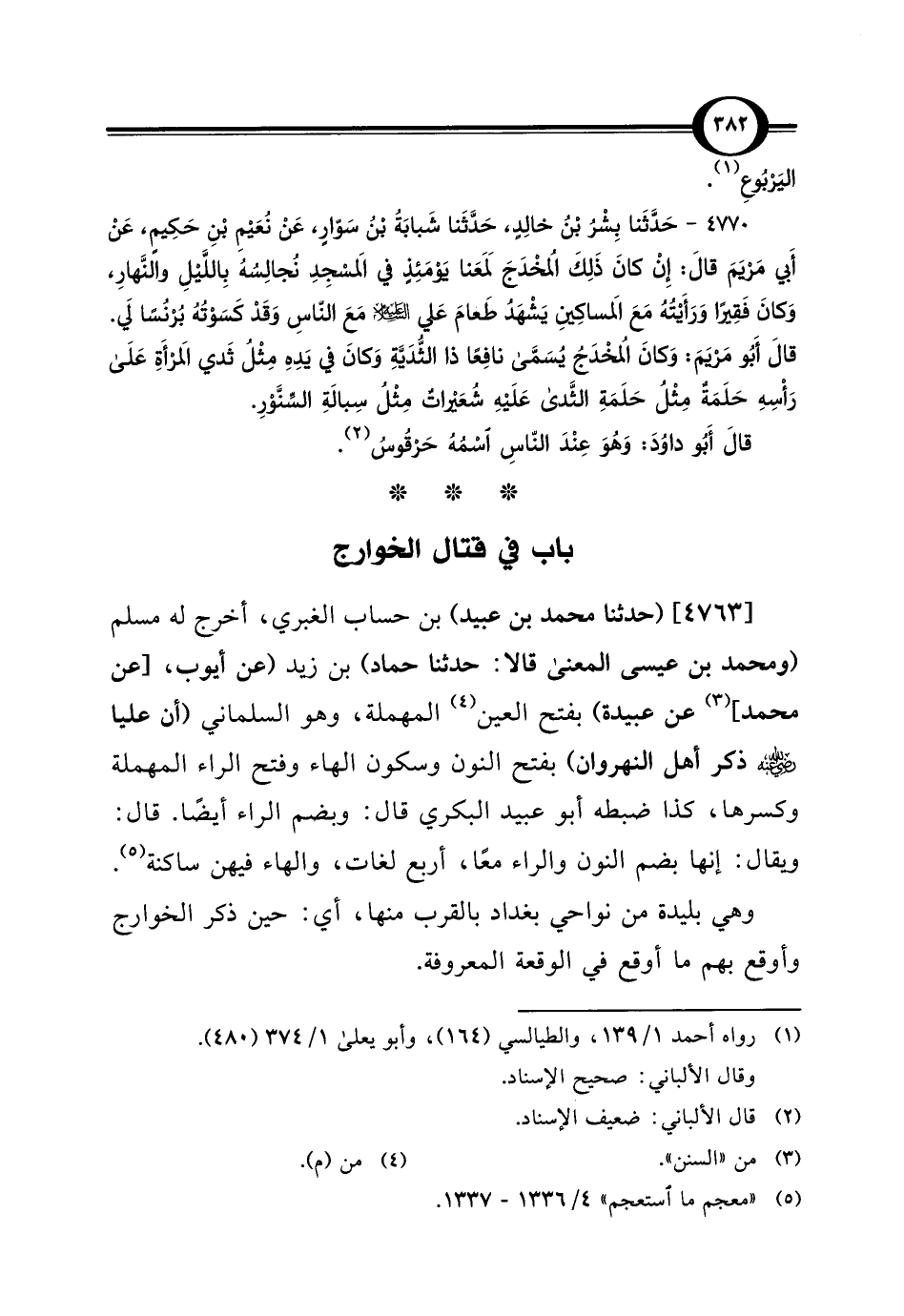 [4763] (حدثنا محمد بن عبيد) بن حساب الغبري، أخرج له مسلم (ومحمد بن عيسى المعنى قالا: حدثنا حماد) بن زيد (عن أيوب، [عن محمد] (¬3) عن عبيدة) بفتح العين (¬4) المهملة، وهو السلماني (أن عليا -رضي اللَّه عنه- ذكر أهل النهروان) بفتح النون وسكون الهاء وفتح الراء المهملة وكسرها، كذا ضبطه أبو عبيد البكري قال: وبضم الراء أيضًا. قال: ويقال: إنها بضم النون والراء معًا، أربع لغات، والهاء فيهن ساكنة (¬5).