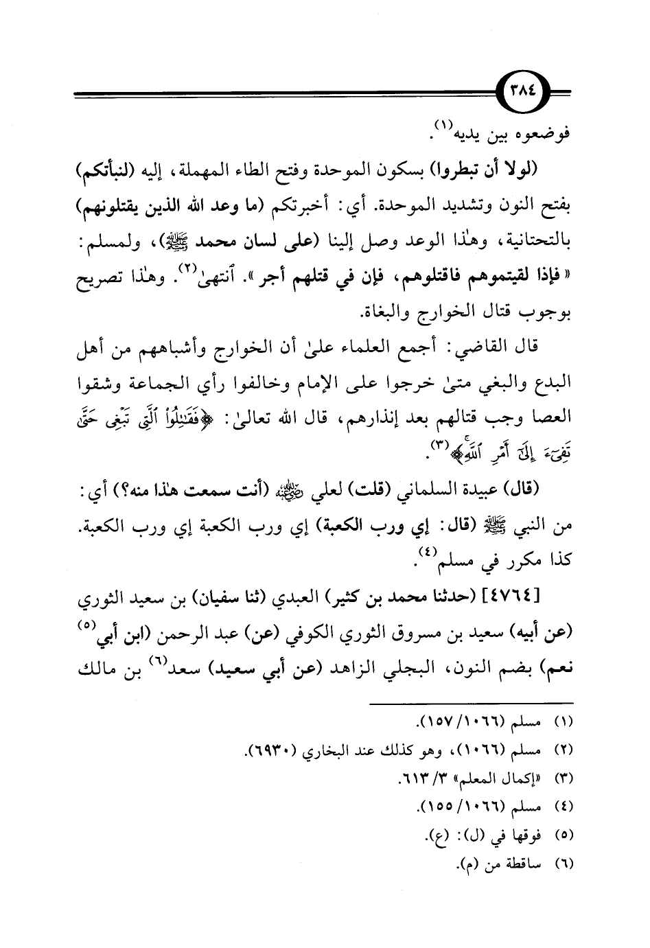 قال القاضي: أجمع العلماء على أن الخوارج وأشباههم من أهل البدع والبغي متى خرجوا على الإمام وخالفوا رأي الجماعة وشقوا العصا وجب قتالهم بعد إنذارهم، قال اللَّه تعالى: {فَقَاتِلُوا الَّتِي تَبْغِي حَتَّى تَفِيءَ إِلَى أَمْرِ اللَّهِ} (¬3).
