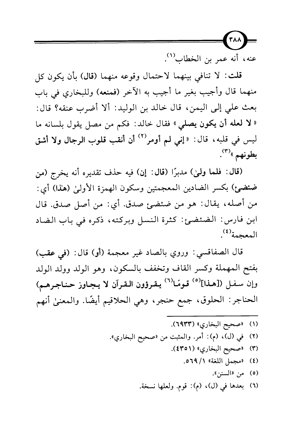 (قال: فلما ولى) مدبرًا (قال: إن) فيه حذف تقديره أنه يخرج (من ضئضئ) بكسر الضادين المعجمتين وسكون الهمزة الأولى (هذا) أي: من أصله، يقال: هو من ضئضئ صدق. أي: من أصل صدق. قال ابن فارس: الضئضئ: كثرة النسل وبركته، ذكره في باب الضاد المعجمة (¬4).