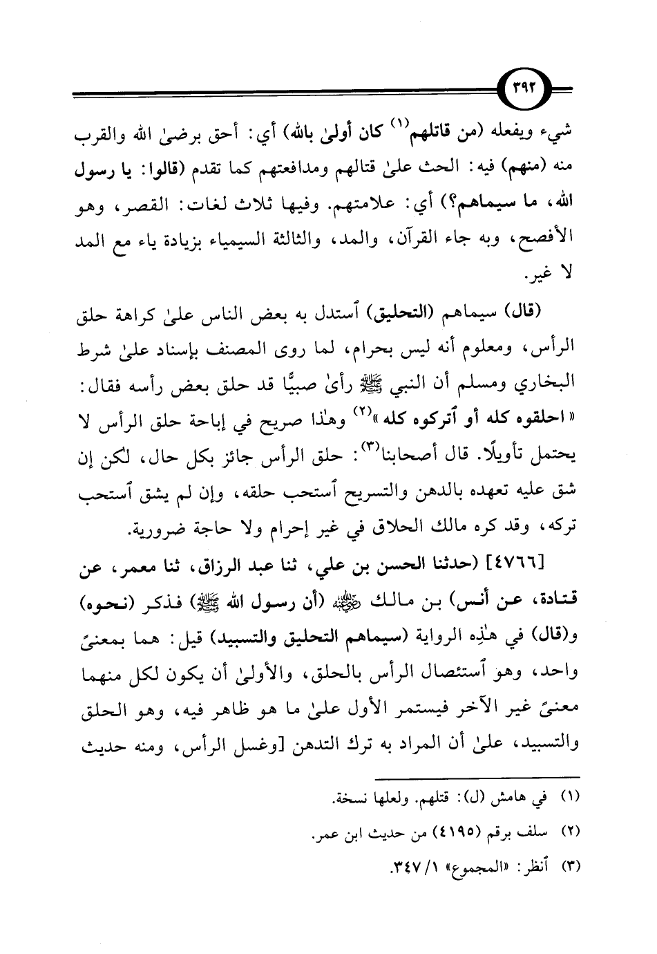 [4766] (حدثنا الحسن بن علي، ثنا عبد الرزاق، ثنا معمر، عن قتادة، عن أنس) بن مالك -رضي اللَّه عنه- (أن رسول اللَّه -صلى اللَّه عليه وسلم-) فذكر (نحوه) و (قال) في هذِه الرواية (سيماهم التحليق والتسبيد) قيل: هما بمعنًى واحد، وهو استئصال الرأس بالحلق، والأولى أن يكون لكل منهما معنًى غير الآخر فيستمر الأول على ما هو ظاهر فيه، وهو الحلق والتسبيد، على أن المراد به ترك التدهن [وغسل الرأس، ومنه حديث