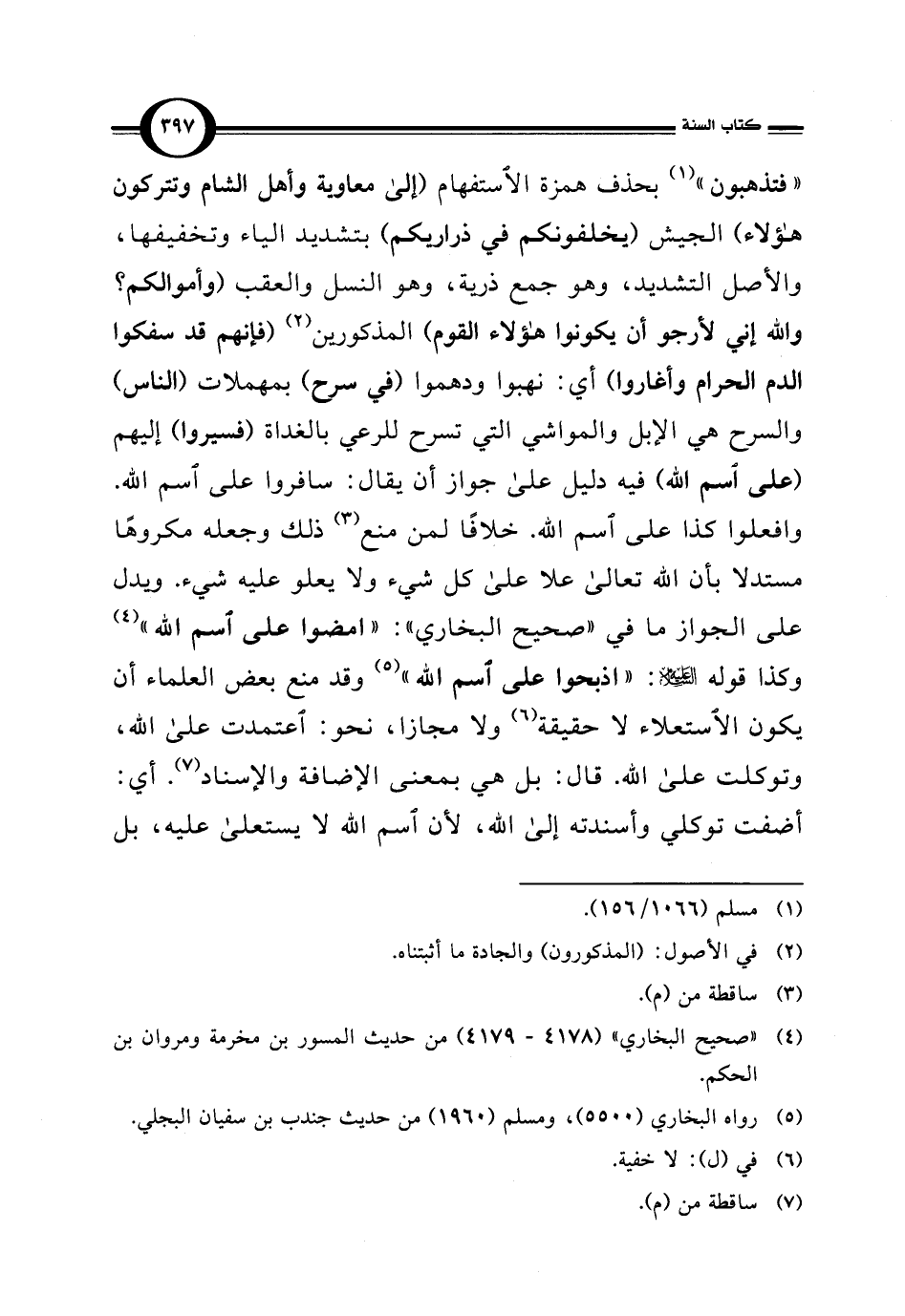 "فتذهبون" (¬1) بحذف همزة الاستفهام (إلى معاوية وأهل الشام وتتركون هؤلاء) الجيش (يخلفونكم في ذراريكم) بتشديد الياء وتخفيفها، والأصل التشديد، وهو جمع ذرية، وهو النسل والعقب (وأموالكم؟ واللَّه إني لأرجو أن يكونوا هؤلاء القوم) المذكورين (¬2) (فإنهم قد سفكوا الدم الحرام وأغاروا) أي: نهبوا ودهموا (في سرح) بمهملات (الناس) والسرح هي الإبل والمواشي التي تسرح للرعي بالغداة (فسيروا) إليهم (على اسم اللَّه) فيه دليل على جواز أن يقال: سافروا على اسم اللَّه. وافعلوا كذا على اسم اللَّه. خلافًا لمن منع (¬3) ذلك وجعله مكروهًا مستدلا بأن اللَّه تعالى علا على كل شيء ولا يعلو عليه شيء. ويدل على الجواز ما في "صحيح البخاري": "امضوا على اسم اللَّه" (¬4) وكذا قوله عليه السلام: "اذبحوا على اسم اللَّه" (¬5) وقد منع بعض العلماء أن يكون الاستعلاء لا حقيقة (¬6) ولا مجازا، نحو: اعتمدت على اللَّه، وتوكلت على اللَّه. قال: بل هي بمعنى الإضافة والإسناد (¬7). أي: أضفت توكلي وأسندته إلى اللَّه، لأن اسم اللَّه لا يستعلى عليه، بل