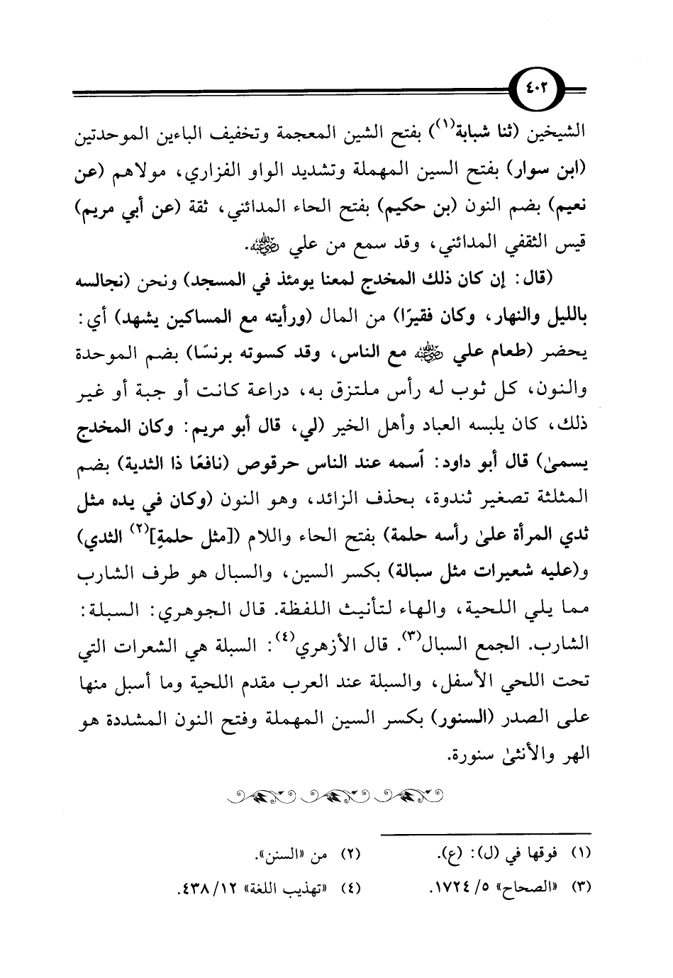 (قال: إن كان ذلك المخدج لمعنا يومئذ في المسجد) ونحن (نجالسه بالليل والنهار، وكان فقيرًا) من المال (ورأيته مع المساكين يشهد) أي: يحضر (طعام علي -رضي اللَّه عنه- مع الناس، وقد كسوته برنسًا) بضم الموحدة والنون، كل ثوب له رأس ملتزق به، دراعة كانت أو جبة أو غير ذلك، كان يلبسه العباد وأهل الخير (لي، قال أبو مريم: وكان المخدج يسمى) قال أبو داود: اسمه عند الناس حرقوص (نافعًا ذا الثدية) بضم المثلثة تصغير ثندوة، بحذف الزائد، وهو النون (وكان في يده مثل ثدي المرأة على رأسه حلمة) بفتح الحاء واللام ([مثل حلمةٍ] (¬2) الثدي) و (عليه شعيرات مثل سبالة) بكسر السين، والسبال هو طرف الشارب مما يلي اللحية، والهاء لتأنيث اللفظة. قال الجوهري: السبلة: الشارب. الجمع السبال (¬3). قال الأزهري (¬4): السبلة هي الشعرات التي تحت اللحي الأسفل، والسبلة عند العرب مقدم اللحية وما أسبل منها على الصدر (السنور) بكسر السين المهملة وفتح النون المشددة هو الهر والأنثى سنورة.