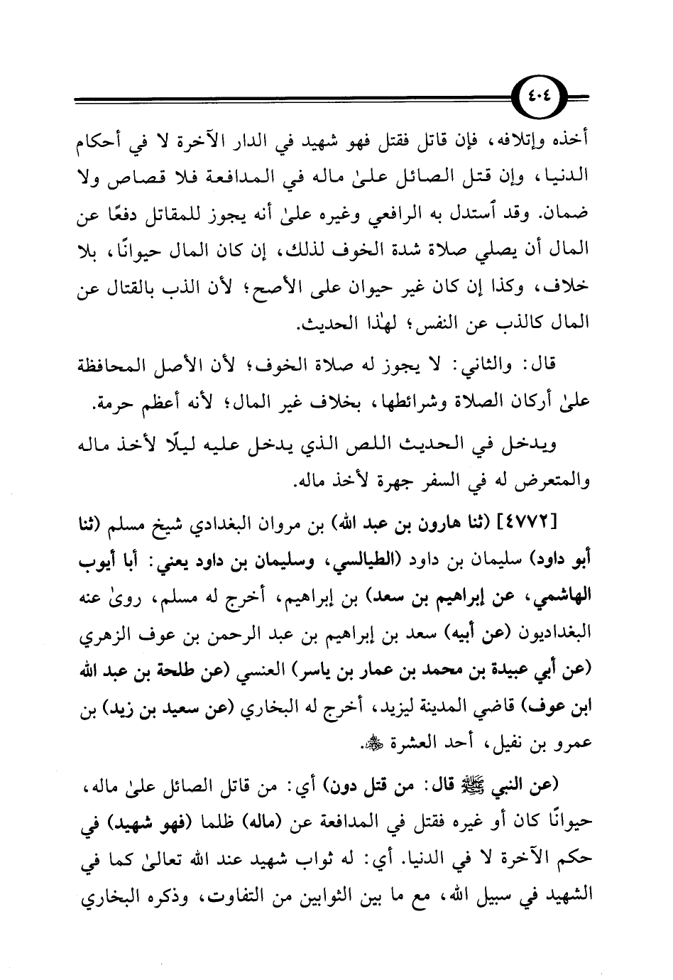 أخذه وإتلافه، فإن قاتل فقتل فهو شهيد في الدار الآخرة لا في أحكام الدنيا، وإن قتل الصائل على ماله في المدافعة فلا قصاص ولا ضمان. وقد استدل به الرافعي وغيره على أنه يجوز للمقاتل دفعًا عن المال أن يصلي صلاة شدة الخوف لذلك، إن كان المال حيوانًا، بلا خلاف، وكذا إن كان غير حيوان على الأصح، لأن الذب بالقتال عن المال كالذب عن النفس؛ لهذا الحديث.
