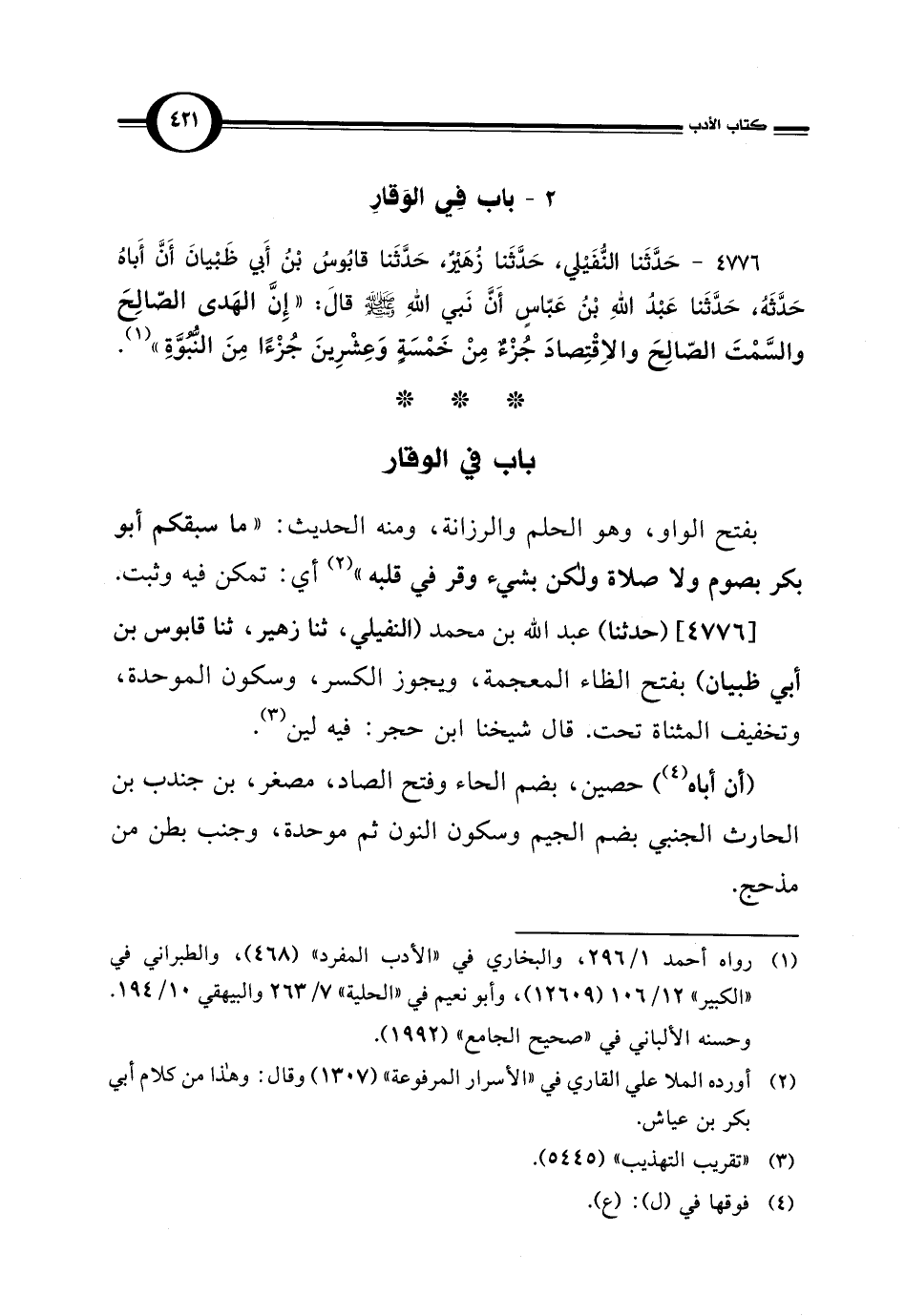 [4776] (حدثنا) عبد اللَّه بن محمد (النفيلي، ثنا زهير، ثنا قابوس بن أبي ظبيان) بفتح الظاء المعجمة، ويجوز الكسر، وسكون الموحدة، وتخفيف المثناة تحت. قال شيخنا ابن حجر: فيه لين (¬3).