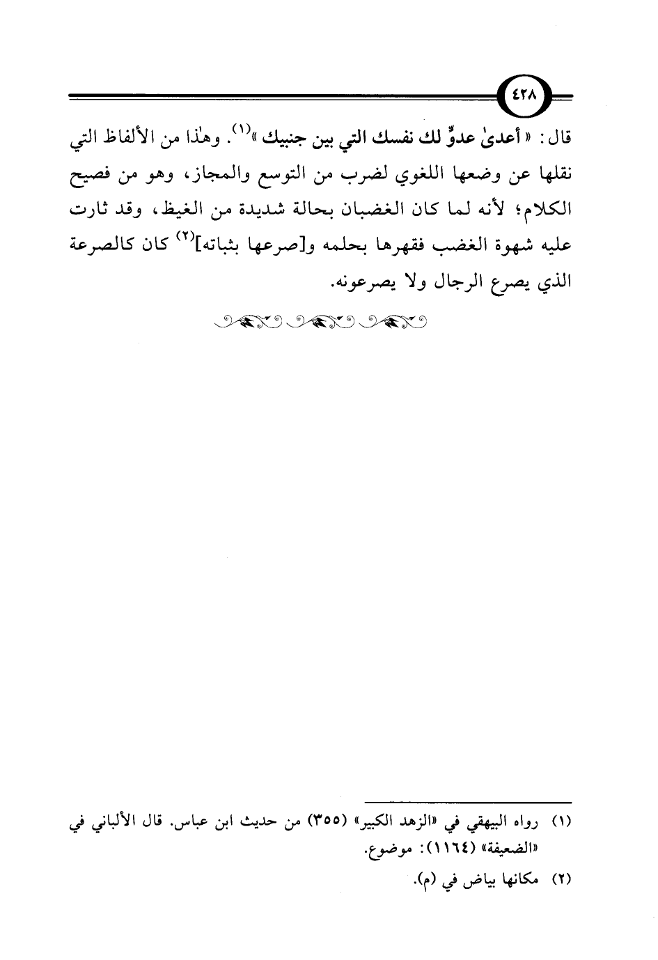 قال: "أعدى عدوٍّ لك نفسك التي بين جنبيك" (¬1). وهذا من الألفاظ التي نقلها عن وضعها اللغوي لضرب من التوسع والمجاز، وهو من فصيح الكلام؛ لأنه لما كان الغضبان بحالة شديدة من الغيظ، وقد ثارت عليه شهوة الغضب فقهرها بحلمه و [صرعها بثباته] (¬2) كان كالصرعة الذي يصرع الرجال ولا يصرعونه.
