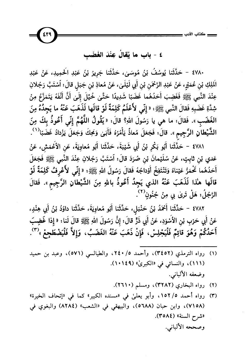 4781 - حَدَّثَنا أَبُو بَكْرِ بْنُ أَبي شَيْبَةَ، حَدَّثَنا أَبُو مُعاوِيَةَ، عَنِ الأَعْمَشِ، عَنْ عَدي بْنِ ثابِتٍ، عَنْ سُلَيْمانَ بْنِ صُرَدَ قالَ: اسْتَبَّ رَجُلانِ عِنْدَ النَّبي -صلى اللَّه عليه وسلم- جعَلَ أَحَدُهُما تَحْمَرُّ عَيْناهُ وَتَنْتَفِخ أَوْداجُهُ فَقالَ رَسُول اللَّهِ -صلى اللَّه عليه وسلم-: "إِنّي لأَعْرِفُ كَلِمَةً لَوْ قالَها هذا لَذَهَبَ عَنْهُ الذي يَجِدُ أَعُوذُ باللَّهِ مِنَ الشَّيْطانِ الرَّجِيمِ". فَقالَ الرَّجُلُ: هَلْ تَرى بي مِنْ جُنُونٍ (¬2).