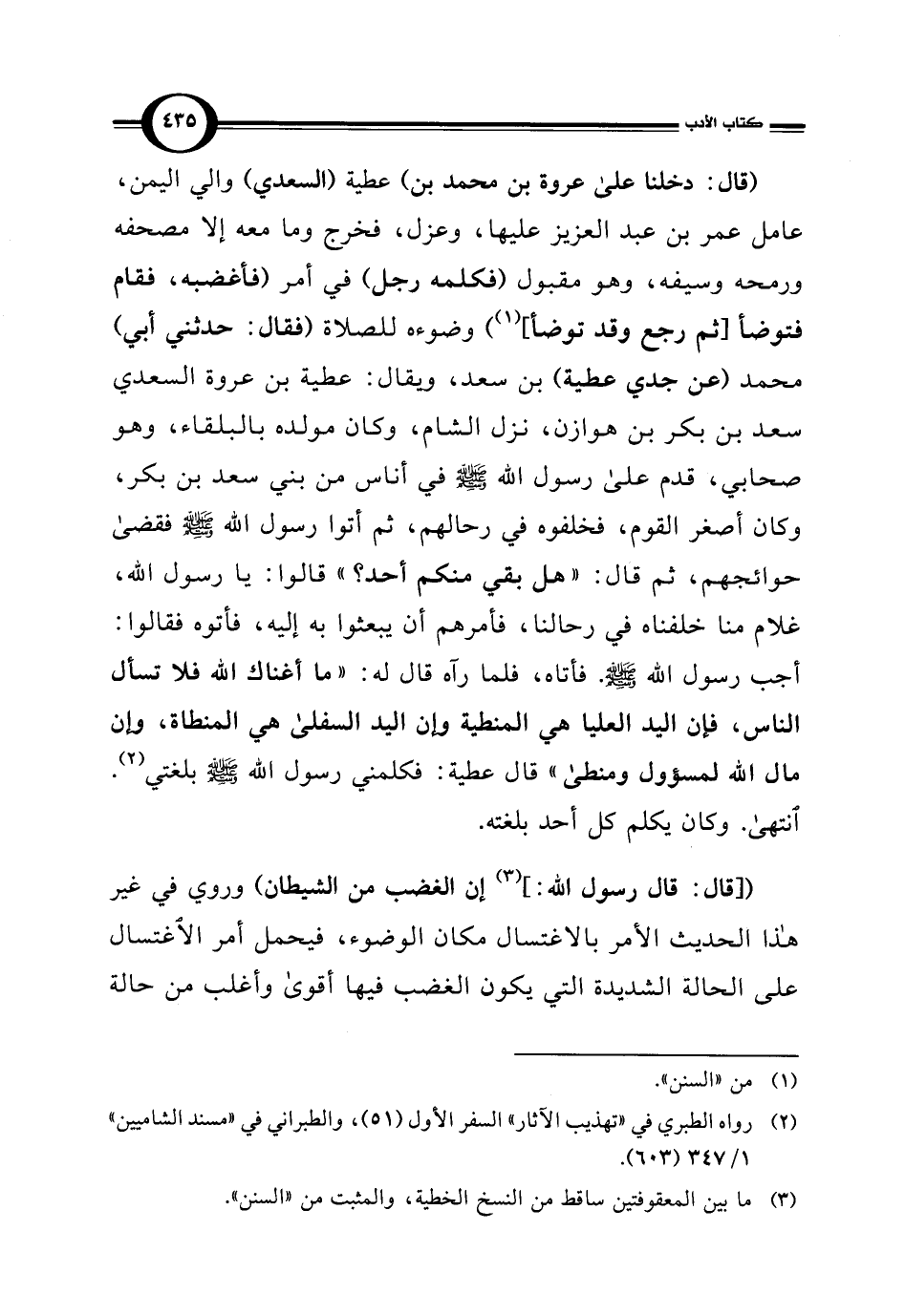 (قال: دخلنا على عروة بن محمد بن) عطية (السعدي) والي اليمن، عامل عمر بن عبد العزيز عليها، وعزل، فخرج وما معه إلا مصحفه ورمحه وسيفه، وهو مقبول (فكلمه رجل) في أمر (فأغضبه، فقام فتوضأ [ثم رجع وقد توضأ]) (¬1) وضوءه للصلاة (فقال: حدثني أبي) محمد (عن جدي عطية) بن سعد، ويقال: عطية بن عروة السعدي سعد بن بكر بن هوازن، نزل الشام، وكان مولده بالبلقاء، وهو صحابي، قدم على رسول اللَّه -صلى اللَّه عليه وسلم- في أناس من بني سعد بن بكر، وكان أصغر القوم، فخلفوه في رحالهم، ثم أتوا رسول اللَّه -صلى اللَّه عليه وسلم- فقضى حوائجهم، ثم قال: "هل بقي منكم أحد؟ " قالوا: يا رسول اللَّه، غلام منا خلفناه في رحالنا، فأمرهم أن يبعثوا به إليه، فأتوه فقالوا: أجب رسول اللَّه -صلى اللَّه عليه وسلم-. فأتاه، فلما رآه قال له: "ما أغناك اللَّه فلا تسأل الناس، فإن اليد العليا هي المنطية وإن اليد السفلى هي المنطاة، وإن مال اللَّه لمسوول ومنطى" قال عطية: فكلمني رسول اللَّه -صلى اللَّه عليه وسلم- بلغتي (¬2). انتهى. وكان يكلم كل أحد بلغته.