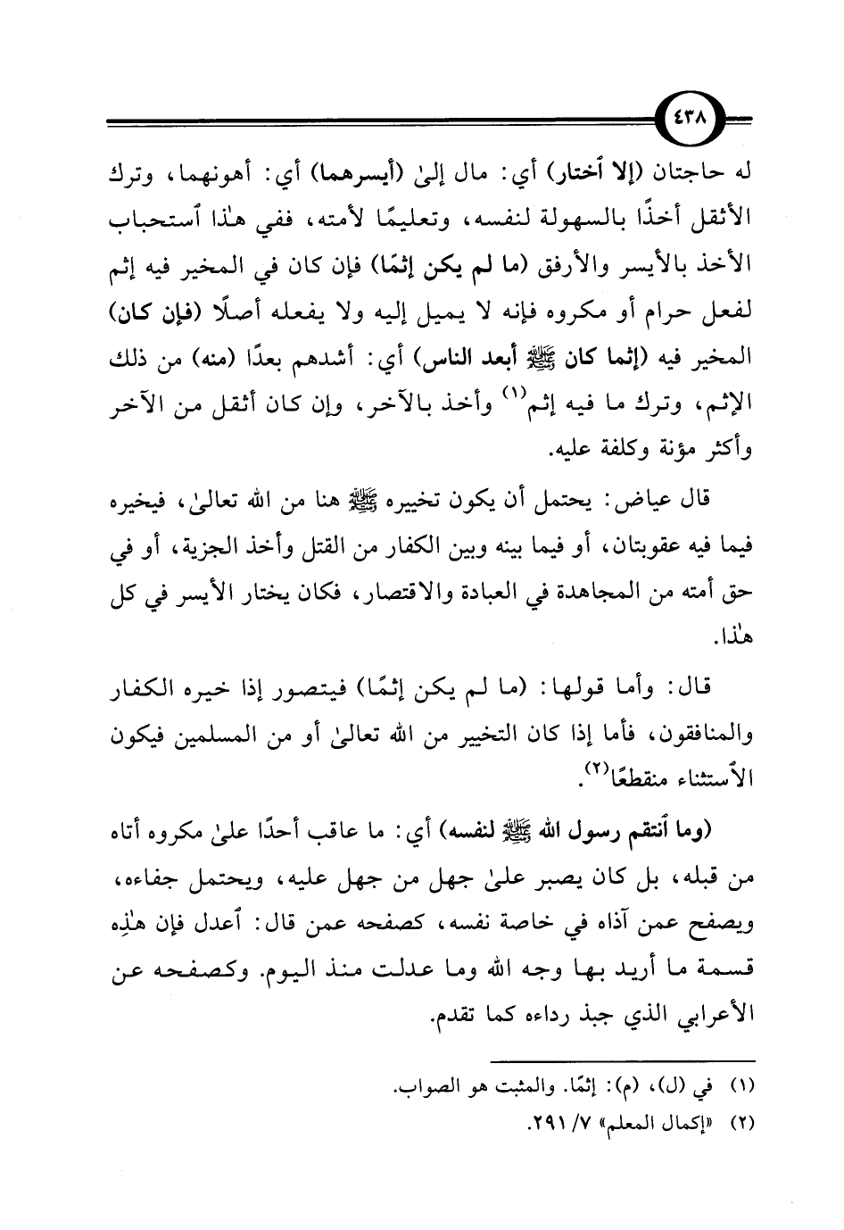 قال: وأما قولها: (ما لم يكن إثمًا) فيتصور إذا خيره الكفار والمنافقون، فأما إذا كان التخيير من اللَّه تعالى أو من المسلمين فيكون الاستثناء منقطعًا (¬2).