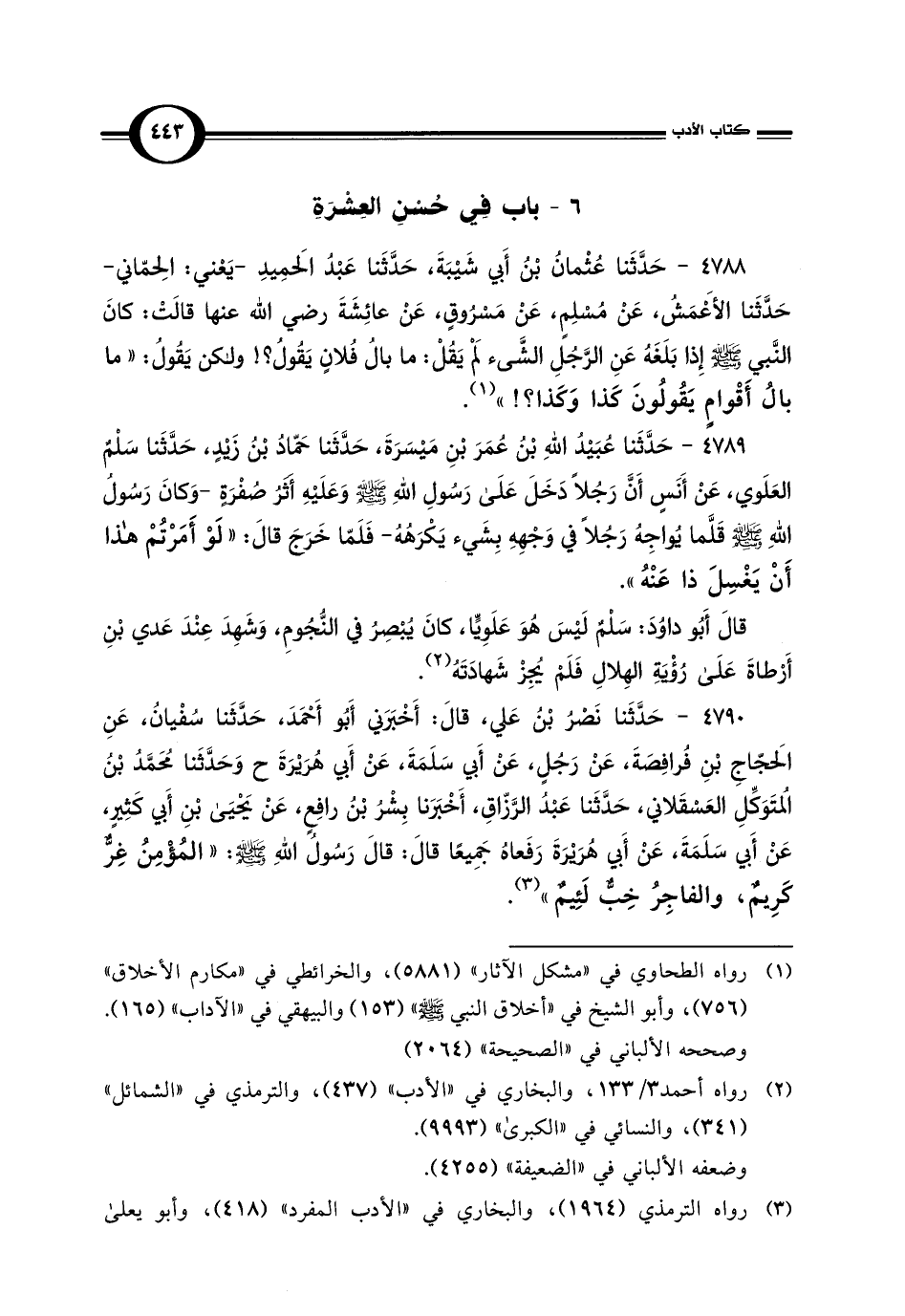 4788 - حَدَّثَنا عُثْمانُ بْنُ أَبِي شَيْبَةَ، حَدَّثَنا عَبْدُ الحَمِيدِ -يَعْني: الحِمّاني- حَدَّثَنا الأَعْمَشُ، عَنْ مُسْلِمٍ، عَنْ مَسْرُوقٍ، عَنْ عائِشَةَ رضي اللَّه عنها قالَتْ: كانَ النَّبي -صلى اللَّه عليه وسلم- إِذا بَلَغَهُ عَنِ الرَّجُلِ الشَّيء لَمْ يَقُلْ: ما بالُ فُلانٍ يَقُولُ؟ ! ولكن يَقُولُ: "ما بالُ أَقْوامٍ يَقُولُونَ كَذا وَكَذا؟ ! " (¬1).