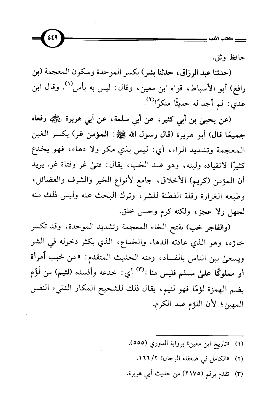 (والفاجر خب) بفتح الخاء المعجمة وتشديد الموحدة، وقد تكسر خاؤه، وهو الذي عادته الدهاء والخداع، الذي يكثر دخوله في الشر ويسعى بين الناس بالفساد، ومنه الحديث المتقدم: "من خبب امرأة أو مملوكًا على مسلم فليس منا" (¬3) أي: خدعه وأفسده (لئيم) من لَؤُم بضم الهمزة لؤمًا فهو لئيم، يقال ذلك للشحيح المكار الدنيء النفس المهين؛ لأن اللؤم ضد الكرم.