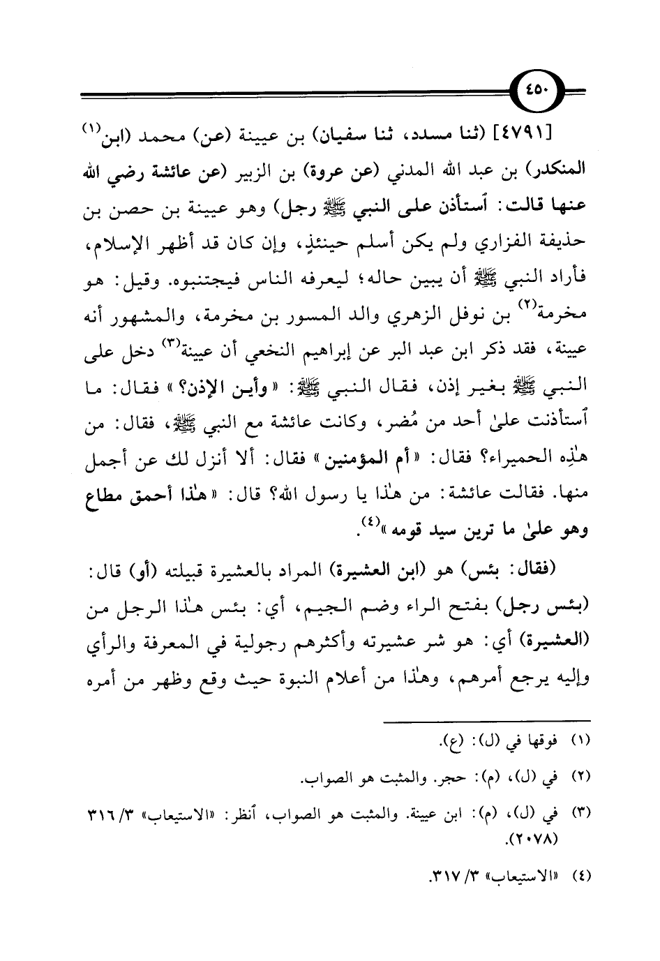 [4791] (ثنا مسدد، ثنا سفيان) بن عيينة (عن) محمد (ابن (¬1) المنكدر) بن عبد اللَّه المدني (عن عروة) بن الزبير (عن عائشة رضي اللَّه عنها قالت: استأذن على النبي -صلى اللَّه عليه وسلم- رجل) وهو عيينة بن حصن بن حذيفة الفزاري ولم يكن أسلم حينئذٍ، وإن كان قد أظهر الإسلام، فأراد النبي -صلى اللَّه عليه وسلم- أن يبين حاله؛ ليعرفه الناس فيجتنبوه. وقيل: هو مخرمة (¬2) بن نوفل الزهري والد المسور بن مخرمة، والمشهور أنه عيينة، فقد ذكر ابن عبد البر عن إبراهيم النخعي أن عيينة (¬3) دخل على النبي -صلى اللَّه عليه وسلم- بغير إذن، فقال النبي -صلى اللَّه عليه وسلم-: "وأين الإذن؟ " فقال: ما استأذنت على أحد من مُضر، وكانت عائشة مع النبي -صلى اللَّه عليه وسلم-، فقال: من هذِه الحميراء؟ فقال: "أم المؤمنين" فقال: ألا أنزل لك عن أجمل منها. فقالت عائشة: من هذا يا رسول اللَّه؟ قال: "هذا أحمق مطاع وهو على ما ترين سيد قومه" (¬4).