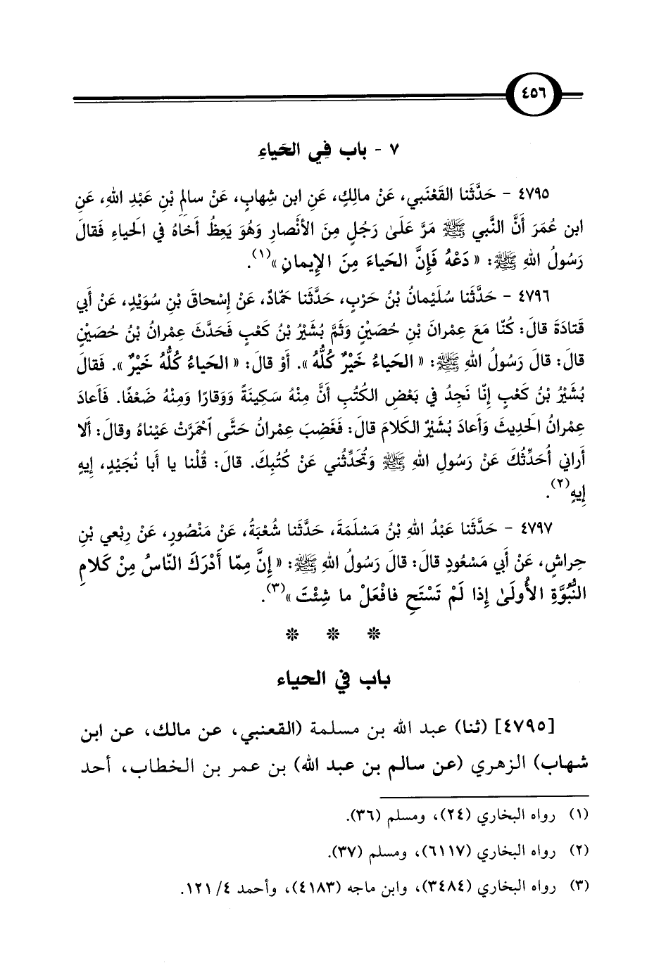 4795 - حَدَّثَنا القَعْنَبي، عَنْ مالِكٍ، عَنِ ابن شِهابٍ، عَنْ سالِمِ بنِ عَبْدِ اللَّهِ، عَنِ ابن عُمَرَ أَنَّ النَّبي -صلى اللَّه عليه وسلم- مَرَّ عَلَى رَجُلٍ مِنَ الأَنْصارِ وَهُوَ يَعِظُ أَخاهُ في الحَياءِ فَقالَ رَسُولُ اللَّهِ -صلى اللَّه عليه وسلم-: "دَعْهُ فَإِنَّ الحَياءَ مِنَ الإِيمانِ" (¬1).