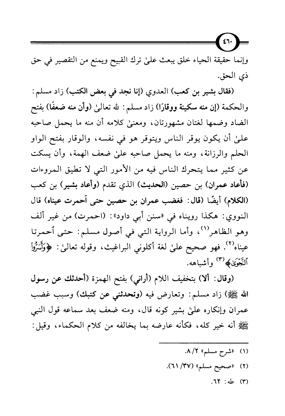 (فقال بشير بن كعب) العدوي (إنا نجد في بعض الكتب) زاد مسلم: والحكمة (إن منه سكينة ووقارًا) زاد مسلم: للَّه تعالى (وأن منه ضعفًا) بفتح الضاد وضمها لغتان مشهورتان، ومعنى كلامه أن منه ما يحمل صاحبه على أن يكون يوقر الناس ويتوقر هو في نفسه، والوقار بفتح الواو الحلم والرزانة، ومنه ما يحمل صاحبه على ضعف الهمة، وأن يسكت عن كثير مما يتحرك الناس فيه من الأمور التي لا تطيق المروءات (فأعاد عمران) بن حصين (الحديث) الذي تقدم (وأعاد بشير) بن كعب (الكلام) أيضًا (قال: فغضب عمران بن حصين حتى احمرت عيناه) قال النووي: هكذا رويناه في "سنن أبي داود": (احمرت) من غير ألف وهو الظاهر (¬1)، وأما الرواية التي في أصول مسلم: حتى احمرتا عيناه (¬2). فهو صحيح على لغة أكلوني البراغيث، وقوله تعالى: {وَأَسَرُّوا النَّجْوَى} (¬3) وأشباهه.