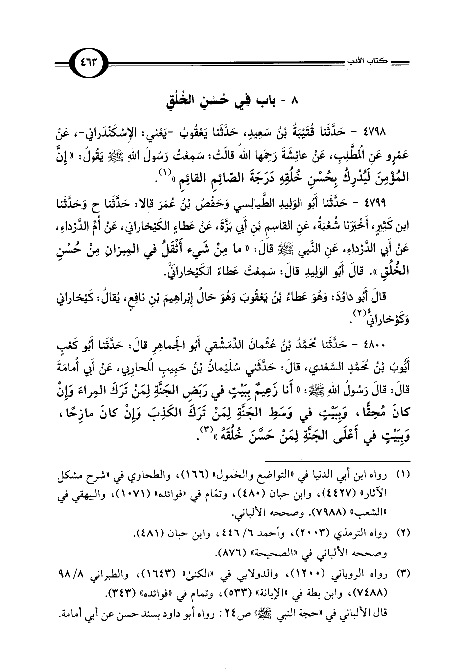 4800 - حَدَّثَنا مُحَمَّدُ بْنُ عُثْمانَ الدِّمَشْقي أَبُو الجَماهِرِ قالَ: حَدَّثَنا أَبُو كَعْبٍ أَيُّوبُ بْنُ مُحَمَّدٍ السَّعْدي، قالَ: حَدَّثَني سُلَيْمانُ بْنُ حَبِيب المُحارِبي، عَنْ أَبي أُمامَةَ قالَ: قالَ رَسُولُ اللَّهِ -صلى اللَّه عليه وسلم-: "أَنا زَعِيمٌ بِبَيْتٍ في رَبَضِ الجَنَّةِ لِمَنْ تَرَكَ المِراءَ وَإِنْ كانَ مُحِقًّا، وَبِبَيْتٍ في وَسَطِ الجَنَّةِ لِمَنْ تَرَكَ الكَذِبَ وَإِنْ كانَ مازِحًا، وَبِبَيْتٍ في أَعْلَى الجَنَّةِ لِمَنْ حَسَّنَ خُلُقَهُ" (¬3).