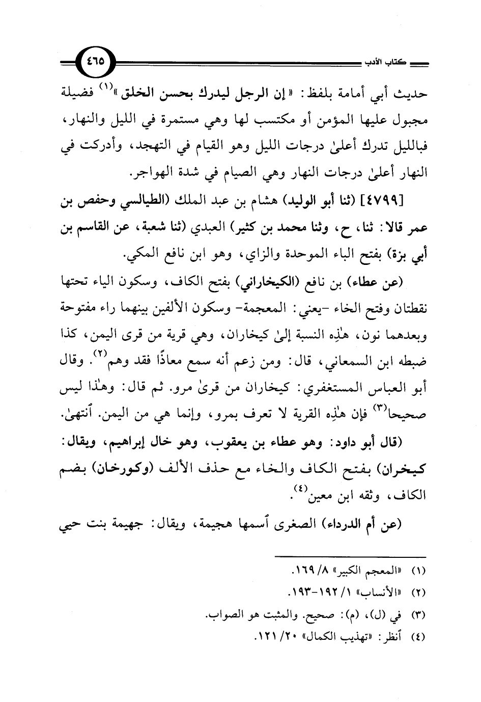 حديث أبي أمامة بلفظ: "إن الرجل ليدرك بحسن الخلق" (¬1) فضيلة مجبول عليها المؤمن أو مكتسب لها وهي مستمرة في الليل والنهار، فبالليل تدرك أعلى درجات الليل وهو القيام في التهجد، وأدركت في النهار أعلى درجات النهار وهي الصيام في شدة الهواجر.