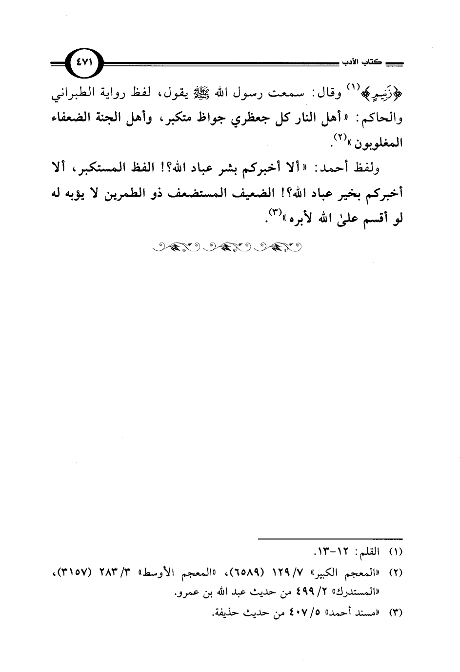 {زَنِيمٍ} (¬1) وقال: سمعت رسول اللَّه -صلى اللَّه عليه وسلم- يقول، لفظ رواية الطبراني والحاكم: "أهل النار كل جعظري جواظ متكبر، وأهل الجنة الضعفاء المغلوبون" (¬2).