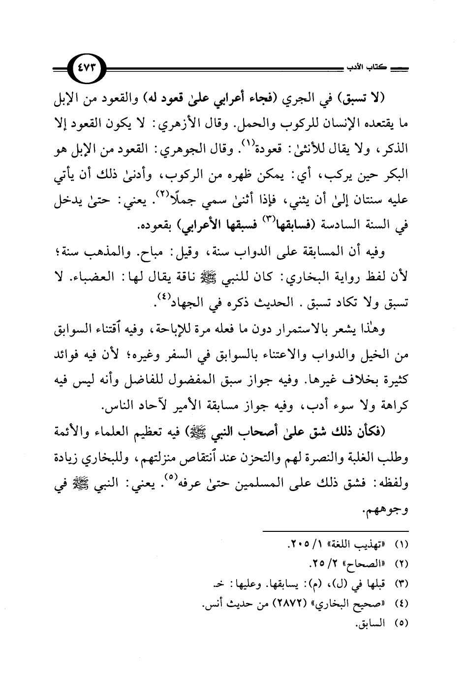 (لا تسبق) في الجري (فجاء أعرابي على قعود له) والقعود من الإبل ما يقتعده الإنسان للركوب والحمل. وقال الأزهري: لا يكون القعود إلا الذكر، ولا يقال للأنثى: قعودة (¬1). وقال الجوهري: القعود من الإبل هو البكر حين يركب، أي: يمكن ظهره من الركوب، وأدنى ذلك أن يأتي عليه سنتان إلى أن يثني، فإذا أثنى سمي جملًا (¬2). يعني: حتى يدخل في السنة السادسة (فسابقها (¬3) فسبقها الأعرابي) بقعوده.