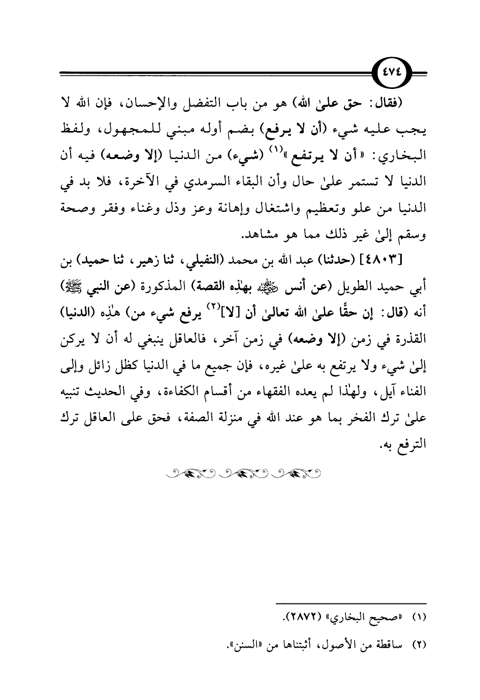 [4803] (حدثنا) عبد اللَّه بن محمد (النفيلي، ثنا زهير، ثنا حميد) بن أبي حميد الطويل (عن أنس -رضي اللَّه عنه- بهذِه القصة) المذكورة (عن النبي -صلى اللَّه عليه وسلم-) أنه (قال: إن حقًّا على اللَّه تعالى أن [لا] (¬2) يرفع شيء من) هذِه (الدنيا) القذرة في زمن (إلا وضعه) في زمن آخر، فالعاقل ينبغي له أن لا يركن إلى شيء ولا يرتفع به على غيره، فإن جميع ما في الدنيا كظل زائل وإلى الفناء آيل، ولهذا لم يعده الفقهاء من أقسام الكفاءة، وفي الحديث تنبيه على ترك الفخر بما هو عند اللَّه في منزلة الصفة، فحق على العاقل ترك الترفع به.