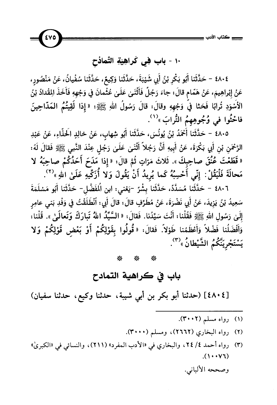 4804 - حَدَّثَنا أَبُو بَكْرِ بْن أَبي شَيْبَةَ، حَدَّثَنا وَكِيعٌ، حَدَّثَنا سُفْيانُ، عَنْ مَنْصُورٍ، عَن إِبْراهِيمَ، عَنْ هَمّامٍ قالَ: جاءَ رَجُلٌ فَأَثْنَى عَلَى عُثْمانَ في وَجْهِهِ فَأَخَذَ المِقْدادُ بْنُ الأَسْوَدِ تُرابًا فَحَثا في وَجْهِهِ وقالَ: قالَ رَسُولُ اللَّهِ -صلى اللَّه عليه وسلم-: "إِذا لَقِيتُمُ المَدّاحِينَ فاحْثُوا في وُجُوهِهِمُ التُّرابَ" (¬1).