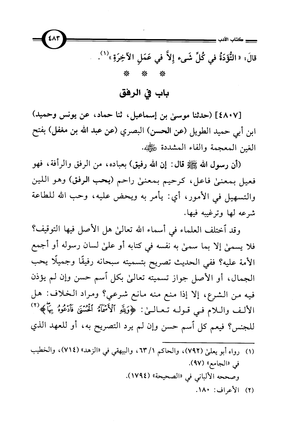 وقد اختلف العلماء في أسماء اللَّه تعالى هل الأصل فيها التوقيف؟ فلا يسمى إلا بما سمى به نفسه في كتابه أو على لسان رسوله أو أجمع الأمة عليه؟ ففي الحديث تصريح بتسميته سبحانه رفيقًا وجميلًا يحب الجمال، أو الأصل جواز تسميته تعالى بكل اسم حسن وإن لم يؤذن فيه من الشرع، إلا إذا منع منه مانع شرعي؟ ومراد الخلاف: هل الألف واللام في قوله تعالى: {وَلِلَّهِ الْأَسْمَاءُ الْحُسْنَى فَادْعُوهُ بِهَا} (¬2) للجنس؟ فيعم كل اسم حسن وإن لم يرد التصريح به، أو للعهد الذي