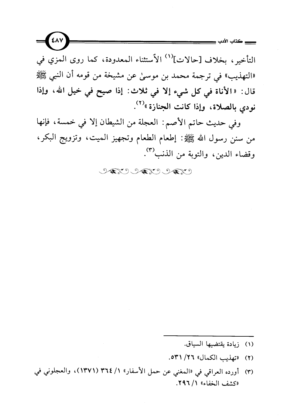 التأخير، بخلاف [حالات] (¬1) الاستثناء المعدودة، كما روى المزي في "التهذيب" في ترجمة محمد بن موسى عن مشيخة من قومه أن النبي -صلى اللَّه عليه وسلم- قال: "الأناة في كل شيء إلا في ثلاث: إذا صيح في خيل اللَّه، وإذا نودي بالصلاة، وإذا كانت الجنازة" (¬2).