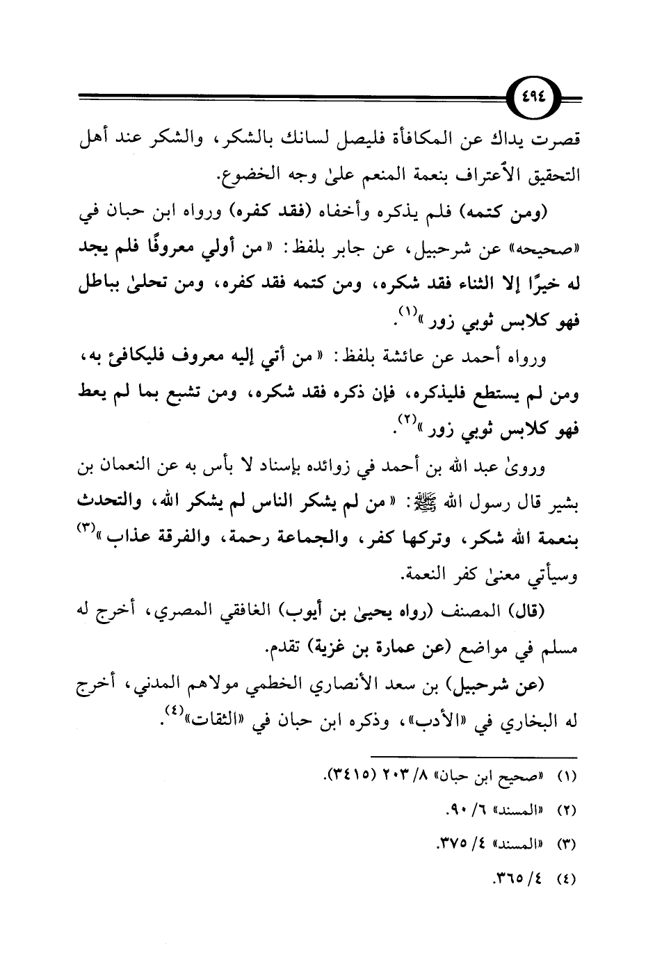 وروى عبد اللَّه بن أحمد في زوائده بإسناد لا بأس به عن النعمان بن بشير قال رسول اللَّه -صلى اللَّه عليه وسلم-: "من لم يشكر الناس لم يشكر اللَّه، والتحدث بنعمة اللَّه شكر، وتركها كفر، والجماعة رحمة، والفرقة عذاب" (¬3) وسيأتي معنى كفر النعمة.