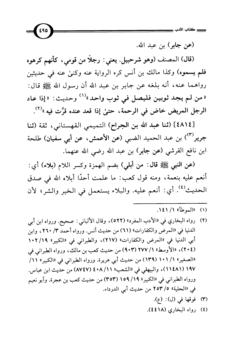 (قال) المصنف (وهو شرحبيل. يعني: رجلًا من قومي، كأنهم كرهوه فلم يسموه) وكذا مالك بن أنس كره الرواية عنه وكنى عنه في حديثين رواهما عنه، أنه بلغه عن جابر بن عبد اللَّه أن رسول اللَّه -صلى اللَّه عليه وسلم- قال: "من لم يجد ثوبين فليصل في ثوب واحد" (¬1) وحديث: "إذا عاد الرجل المريض خاض في الرحمة، حتى إذا قعد عنده قرَّت فيه" (¬2).