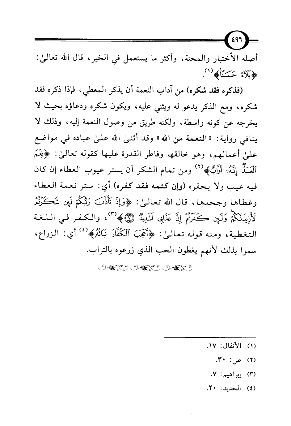 (فذكره فقد شكره) من آداب النعمة أن يذكر المعطي، فإذا ذكره فقد شكره، ومع الذكر يدعو له ويثني عليه، ويكون شكره ودعاؤه بحيث لا يخرجه عن كونه واسطة، ولكنه طريق من وصول النعمة إليه، وذلك لا ينافي رواية: "النعمة من اللَّه" وقد أثنى اللَّه على عباده في مواضع على أعمالهم، وهو خالقها وفاطر القدرة عليها كقوله تعالى: {نِعْمَ الْعَبْدُ إِنَّهُ أَوَّابٌ} (¬2) ومن تمام الشكر أن يستر عيوب العطاء إن كان فيه عيب ولا يحقره (وإن كتمه فقد كفره) أي: ستر نعمة العطاء وغطاها وجحدها، قال اللَّه تعالى: {وَإِذْ تَأَذَّنَ رَبُّكُمْ لَئِنْ شَكَرْتُمْ لَأَزِيدَنَّكُمْ وَلَئِنْ كَفَرْتُمْ إِنَّ عَذَابِي لَشَدِيدٌ (7)} (¬3)، والكفر في اللغة التغطية، ومنه قوله تعالى: {أَعْجَبَ الْكُفَّارَ نَبَاتُهُ} (¬4) أي: الزراع، سموا بذلك لأنهم يغطون الحب الذي زرعوه بالتراب.
