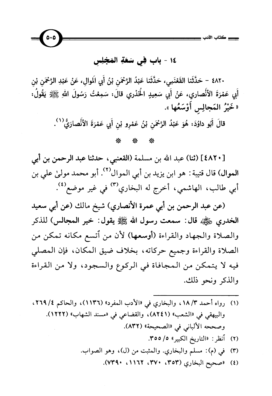[4820] (ثنا) عبد اللَّه بن مسلمة (القعنبي، حدثنا عبد الرحمن بن أبي الموال) قال قتيبة: هو ابن يزيد بن أبي الموال (¬2). أبو محمد مولى علي بن أبي طالب، الهاشمي، أخرج له البخاري (¬3) في غير موضع (¬4).