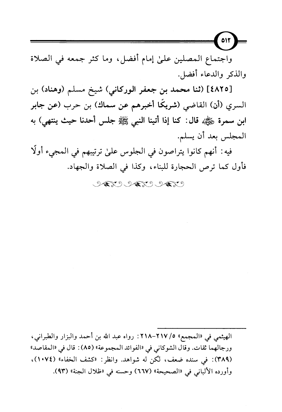 [4825] (ثنا محمد بن جعفر الوركاني) شيخ مسلم (وهناد) بن السري (أن) القاضي (شريكًا أخبرهم عن سماك) بن حرب (عن جابر ابن سمرة -رضي اللَّه عنه- قال: كنا إذا أتينا النبي -صلى اللَّه عليه وسلم- جلس أحدنا حيث ينتهي) به المجلس بعد أن يسلم.