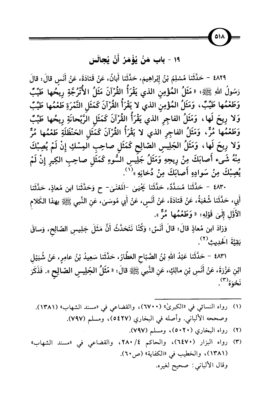 4829 - حَدَّثَنا مُسْلِمُ بْنُ إِبْراهِيمَ، حَدَّثَنا أَبانُ، عَنْ قَتادَةَ، عَنْ أَنَسٍ قالَ: قالَ رَسُولُ اللَّهِ -صلى اللَّه عليه وسلم-: "مَثَلُ المُؤْمِنِ الذي يَقْرَأُ القُرْآنَ مَثَلُ الأُتْرُجَّةِ رِيحُها طَيِّبٌ وَطَعْمُها طَيِّبٌ، وَمَثَلُ المُؤْمِنِ الذي لا يَقْرَأُ القُرْآنَ كَمَثَلِ التَّمْرَةِ طَعْمُها طَيِّبٌ وَلا رِيحَ لَها، وَمَثَلُ الفاجِرِ الذي يَقْرَأُ القُرْآنَ كمَثَلِ الرَّيْحانَةِ رِيحُها طَيِّبٌ وَطَعْمُها مُرٌّ، وَمَثَلُ الفاجِرِ الذي لا يَقْرَأُ القُرْآنَ كَمَثَلِ الحَنْظَلَةِ طَعْمُها مُرٌّ وَلا رِيحَ لَها، وَمَثَلُ الجَلِيسِ الصّالِحِ كَمَثَلِ صاحِبِ المِسْكِ إِنْ لَمْ يُصِبْكَ مِنْهُ شَيء أَصابَكَ مِنْ رِيحِهِ وَمَثَلُ جَلِيسِ السُّوءِ كَمَثَلِ صاحِبِ الكِيرِ إِنْ لَمْ يُصِبْكَ مِنْ سَوادِهِ أَصابَكَ مِنْ دُخانِهِ" (¬1).